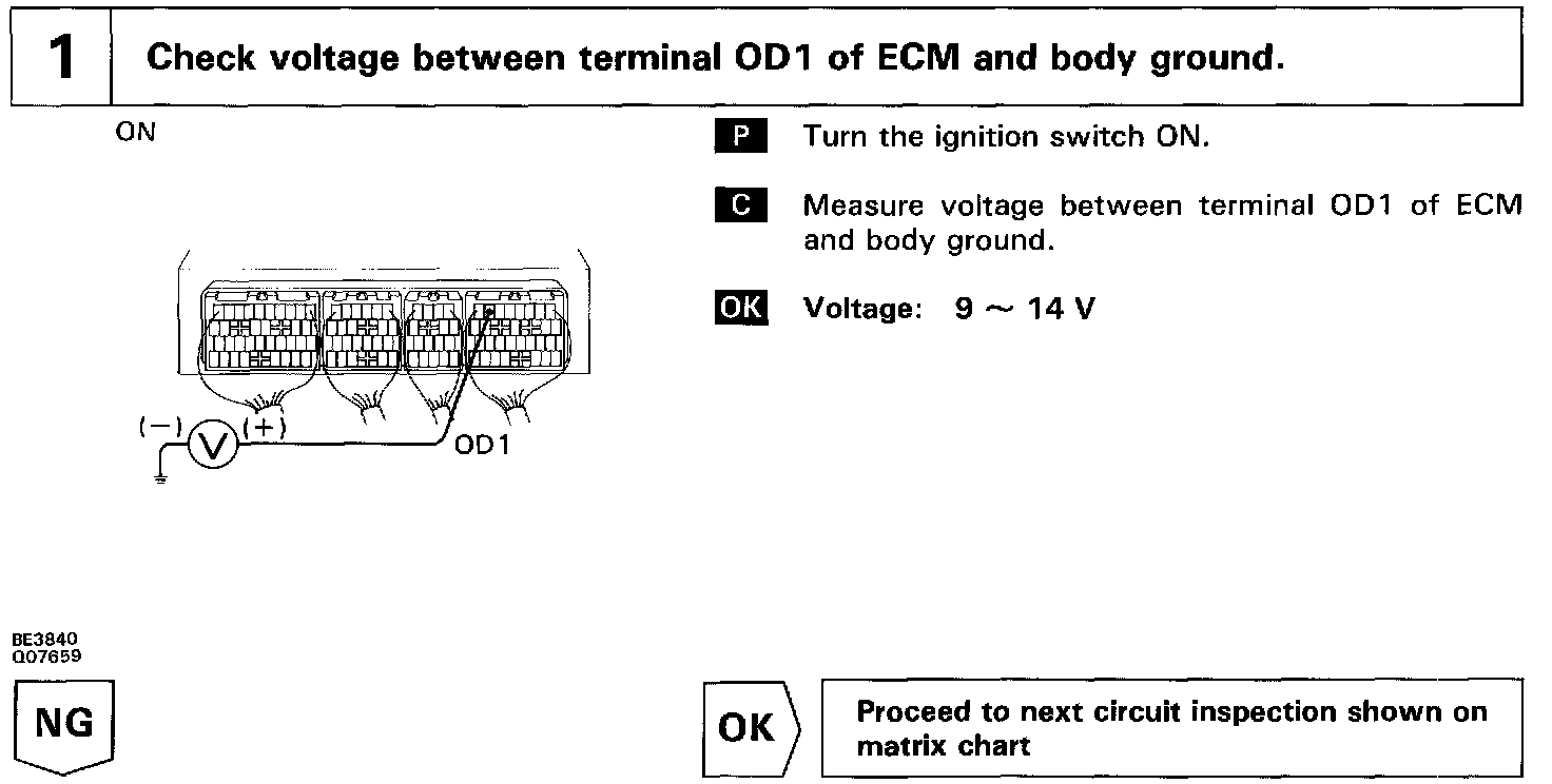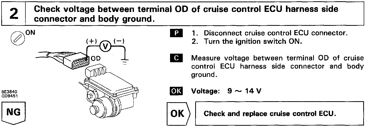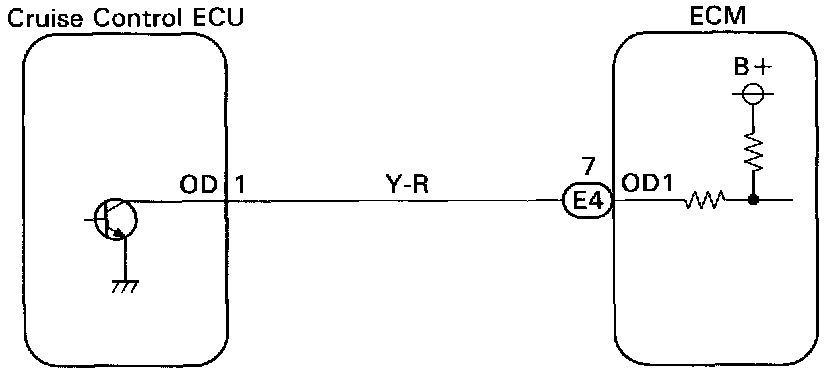 The cruise control ECU sends O/D cut signals to the ECM as necessary and the ECM cancels O/D shifting until these signals are discontinued.