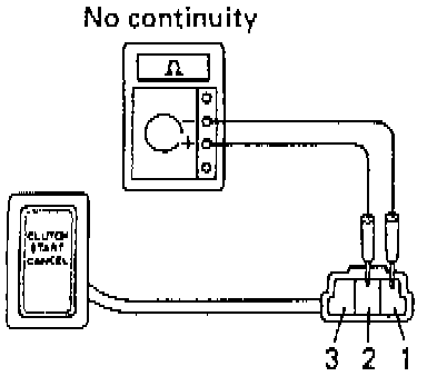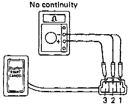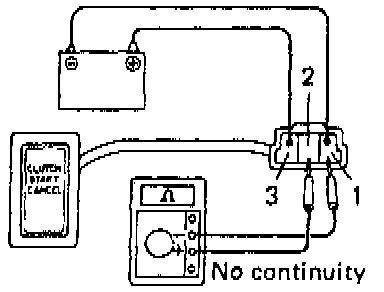 c. Check the there is no continuity between terminals 2 and 3. If continuity is not as specified, replace the clutch start cancel switch.
