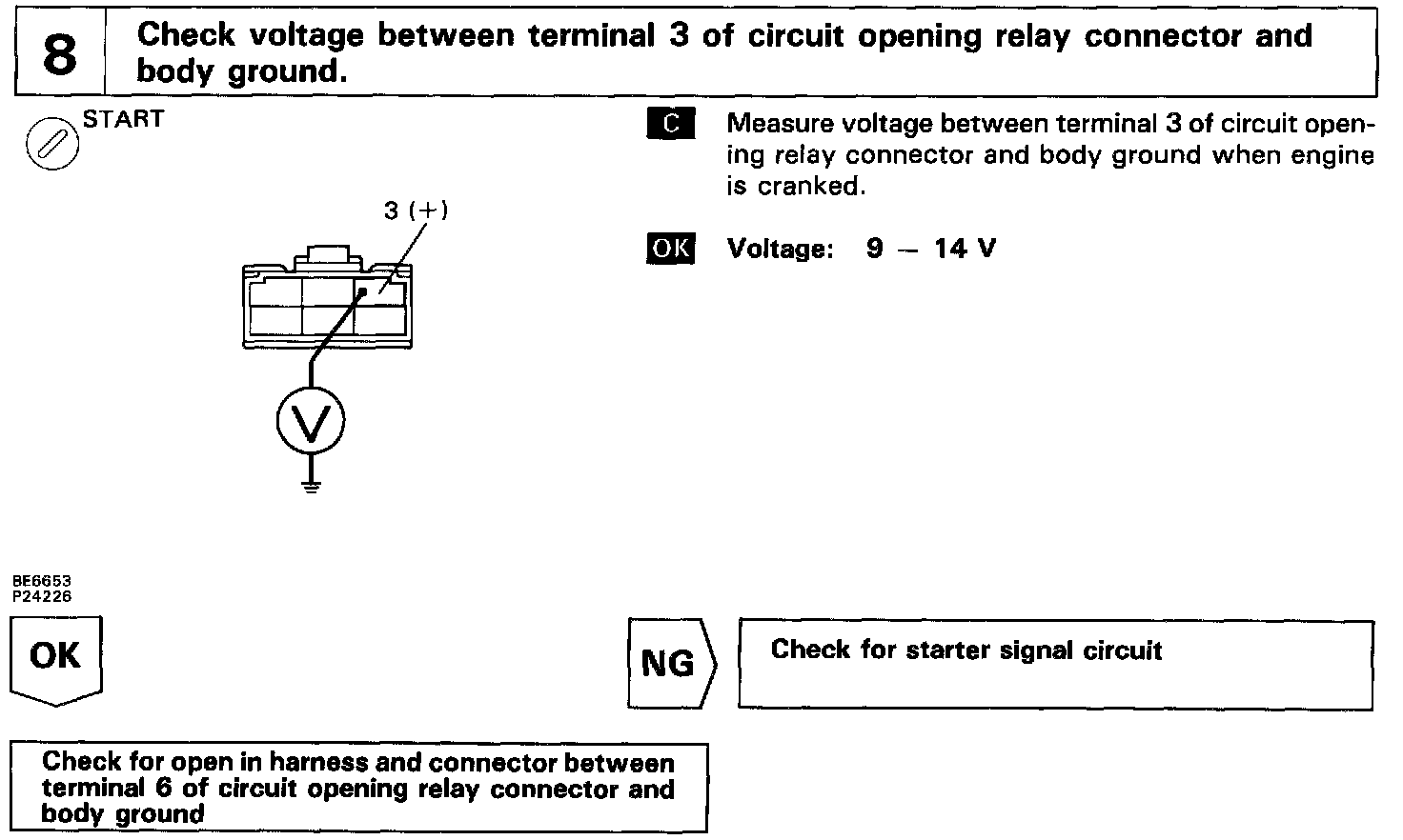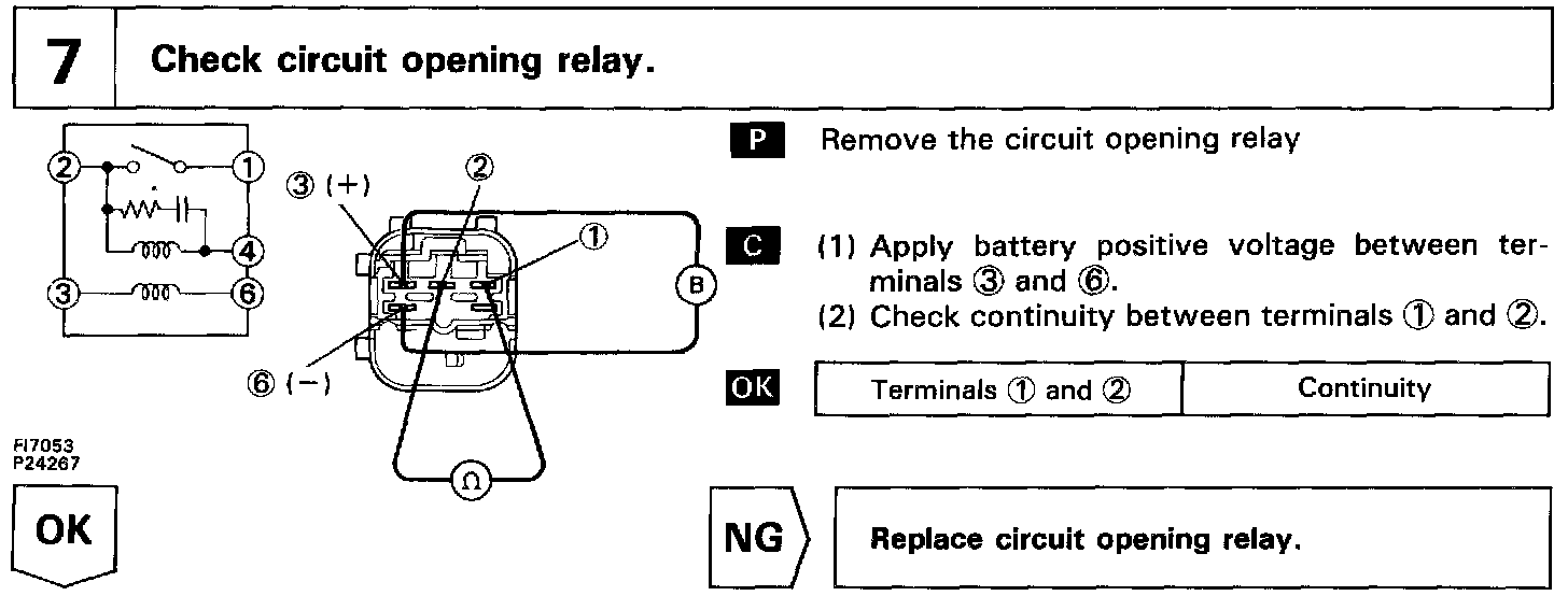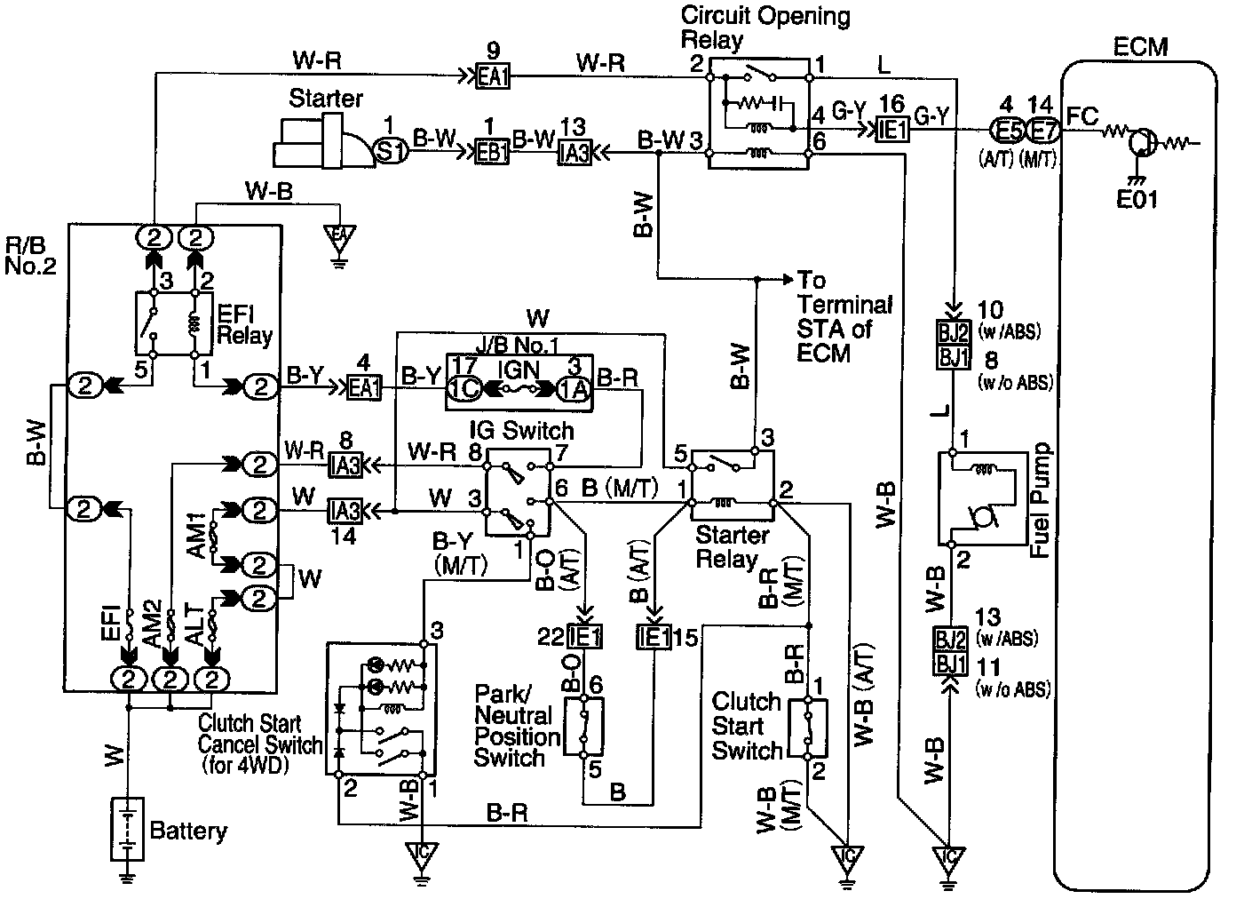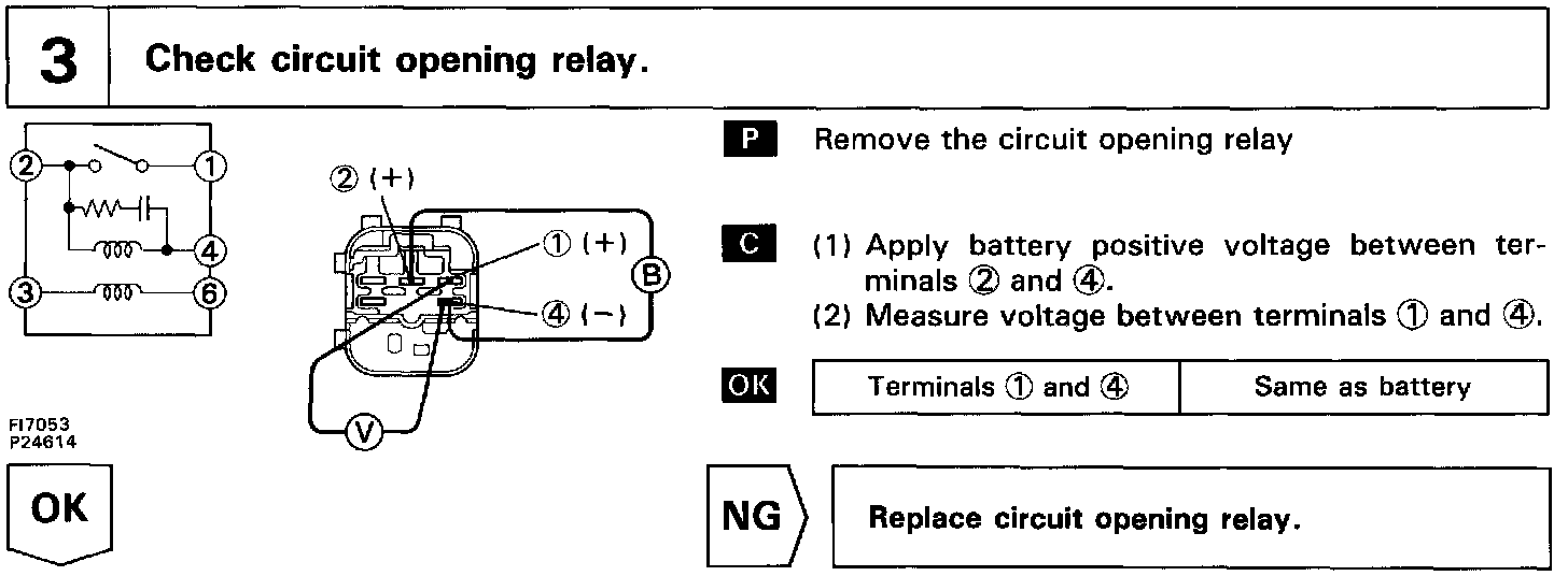 In the diagram below, when the engine is cranked, current flows from terminal ST of the ignition switch to the starter relay coil, the starter relay switches on and current flows to coil L1 of the circuit opening relay. Thus the circuit opening relay switches on, power is supplied to the fuel pump and the fuel pump operates.