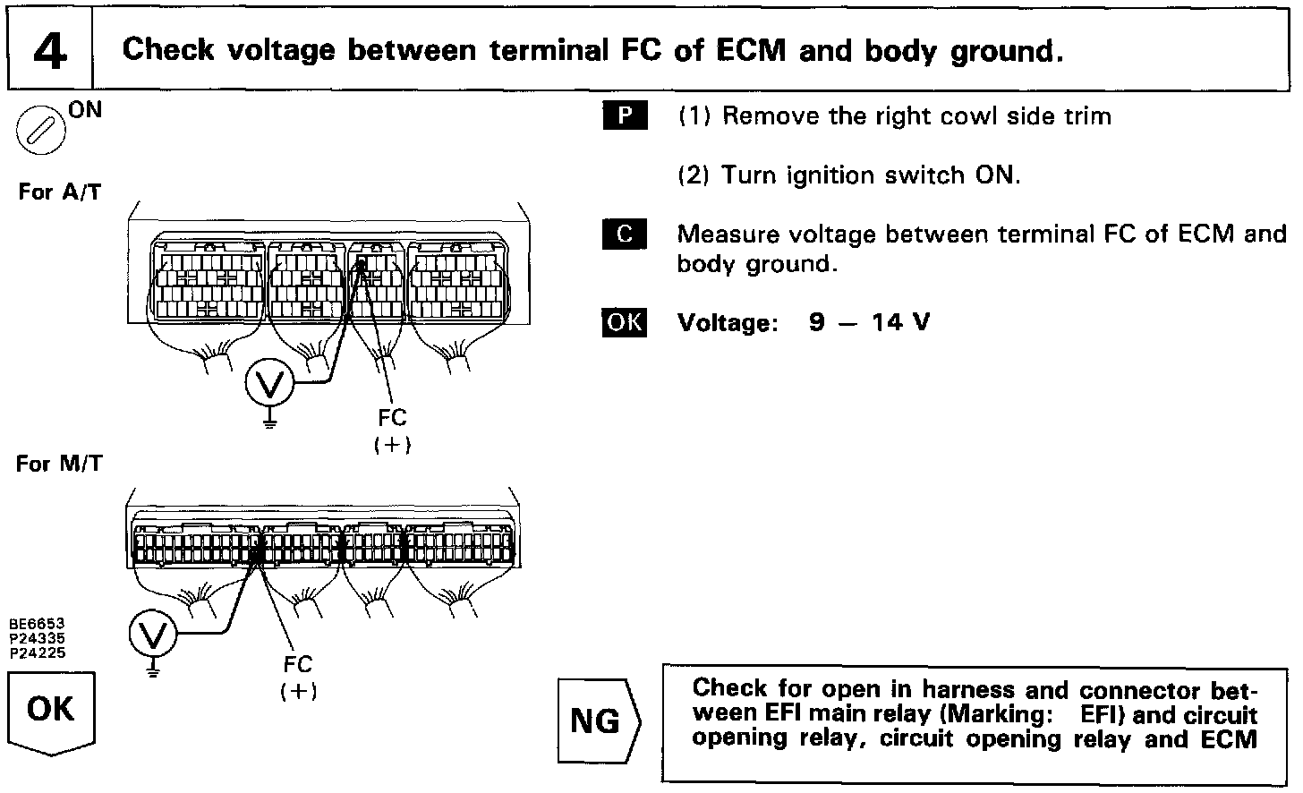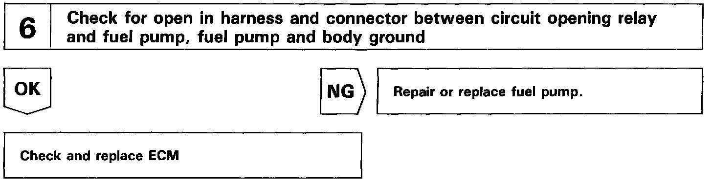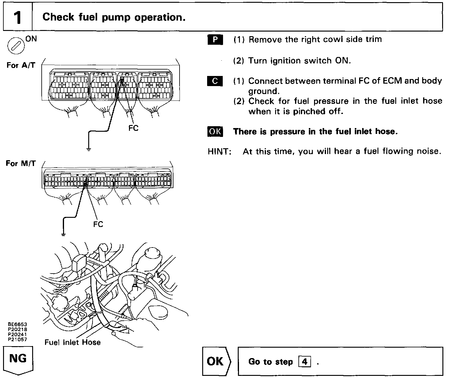 The fuel pump is switched on (low voltage at terminal FC) when STA is on or while the NE signal is input to the ECM.