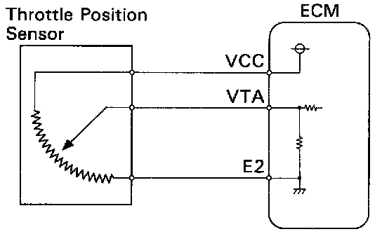 The throttle position sensor is mounted in the throttle body and detects the throttle valve opening angle. When the throttle valve is fully closed, a voltage of approximately 0.7 V is applied to terminal VTA of the ECM. The voltage applied to the terminal VTA of the ECM increases in proportion to the opening angle of the throttle valve and becomes approximately 2.7 - 5.2 V when the throttle valve is fully opened. The ECM judges the vehicle driving conditions from these signals input from terminals VTA and uses them as one of the conditions for deciding the air-fuel ratio correction, power increase correction and fuel-cut control etc.
