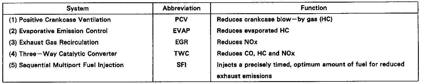 The emission control systems are installed to reduce the amount of CO, HC and NOx exhausted from the engine ((3), (4) and (5)), to prevent the atmospheric release of blow-by gas-containing HC (1) and evaporated fuel containing HC being released from the fuel tank (2).