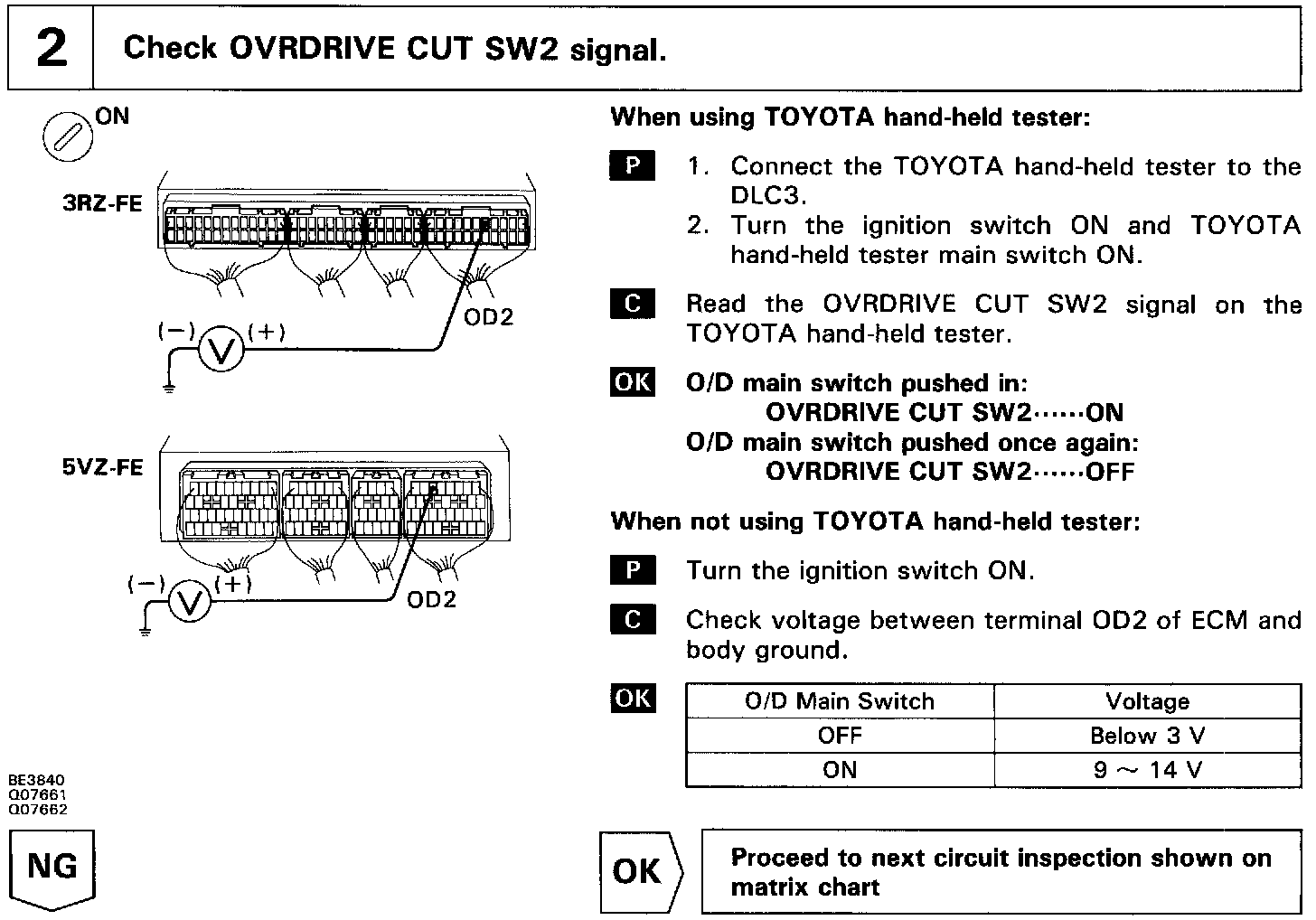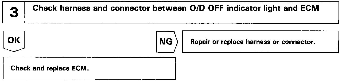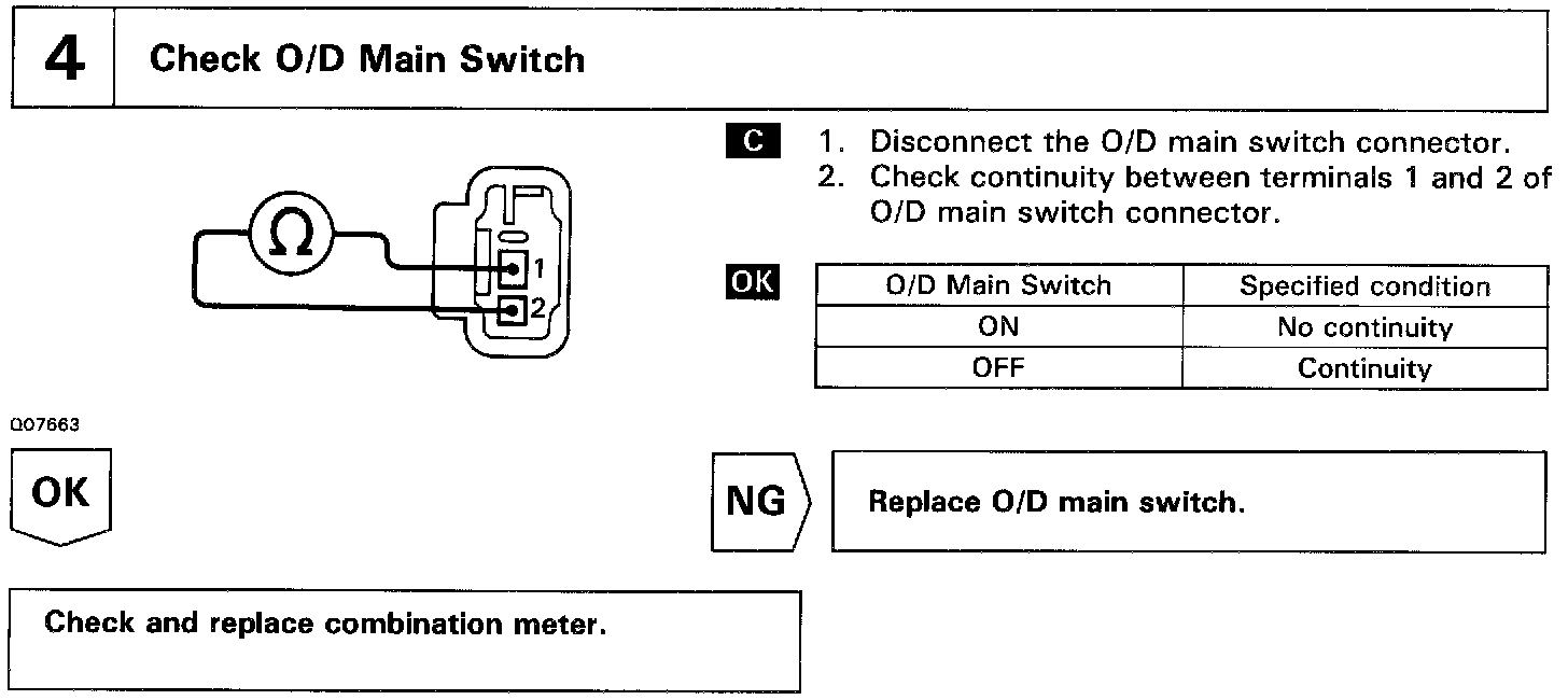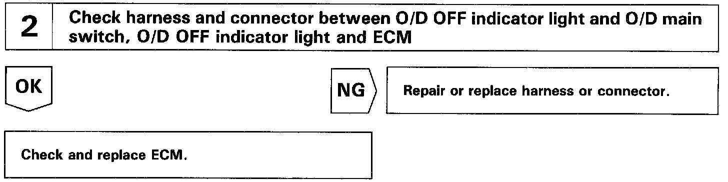 The O/D main switch contacts go open when the switch is pushed in and go closed when it is pushed once again. In O/D main switch OFF position, the O/D OFF indicator lights up, and the ECM prohibits shifting to O/D.