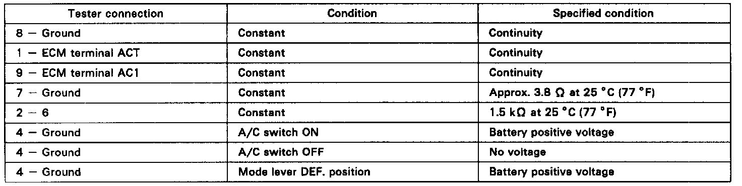 b. Connect the connector to A/C amplifier and inspect wire harness side connector from the back side, as shown in the chart.