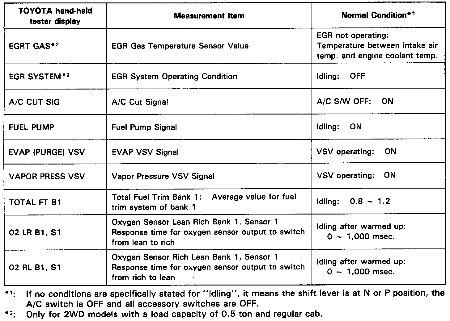 NOTICE: The values given below for "Normal Condition" are representative values. so a vehicle may still be normal even if its value varies from those listed here. So do not decide whether a part is faulty or not solely according to the "Normal Condition" here.