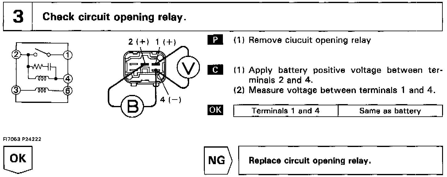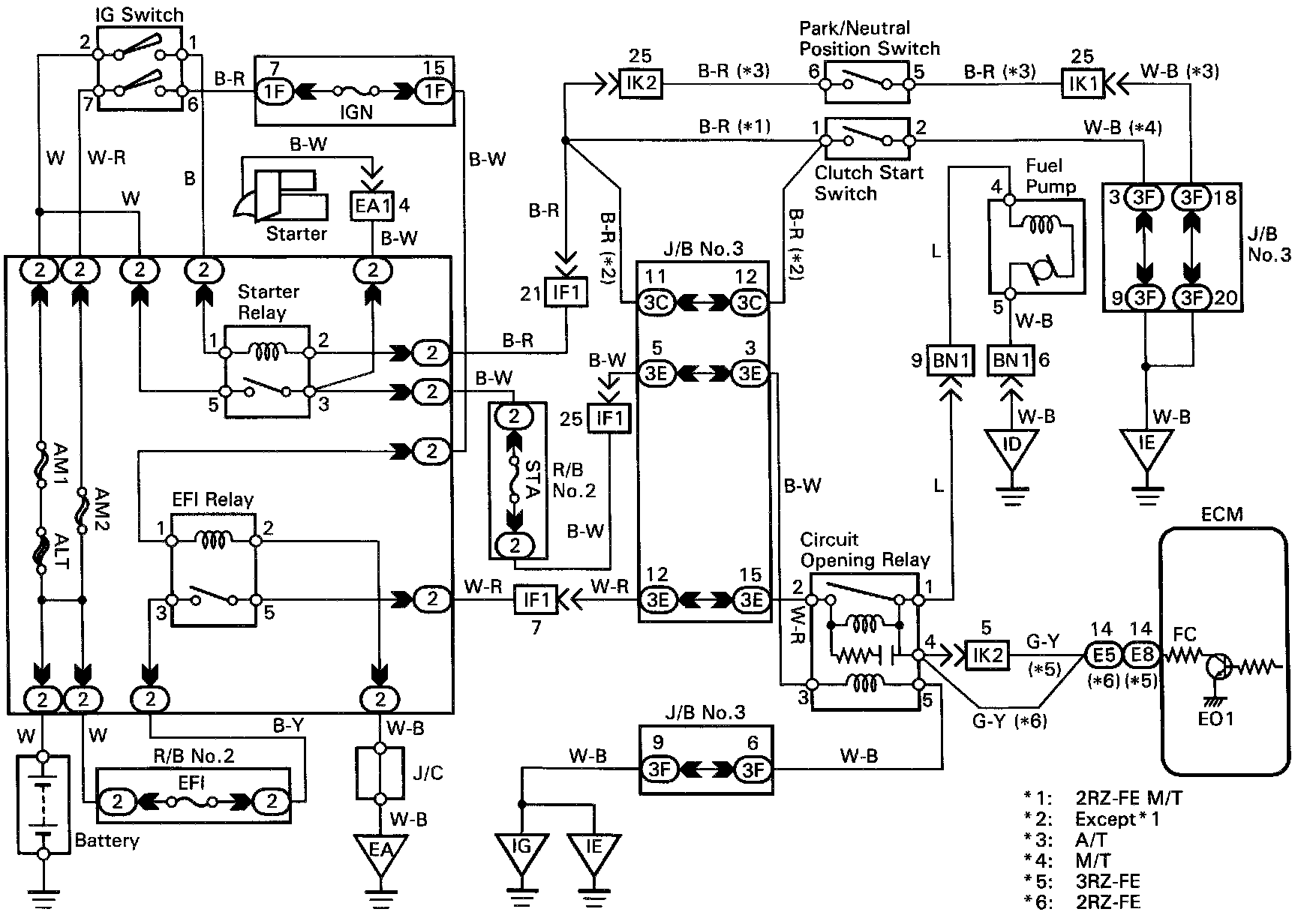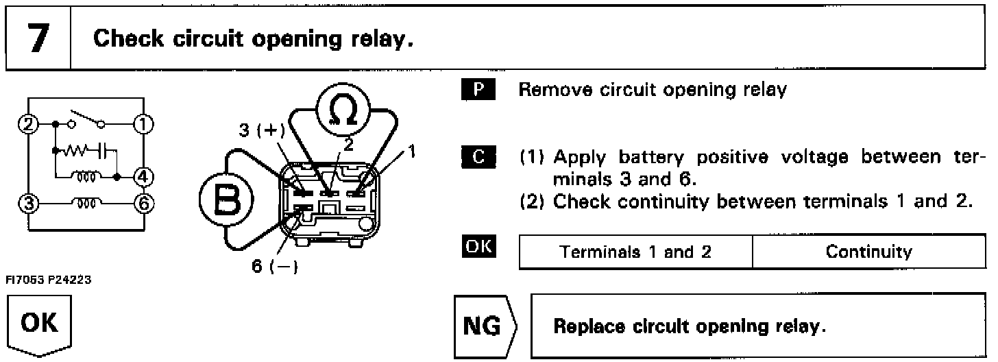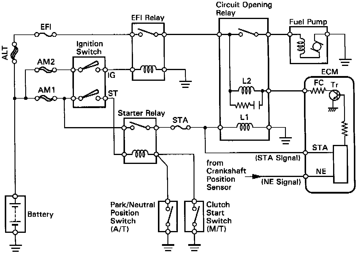 In the diagram below, when the engine is cranked, current flows from terminal ST of the ignition switch to the starter relay coil, the starter relay switches on and current flows to coil L1 of the circuit opening relay. Thus the circuit opening relay switches on, power is supplied to the fuel pump and the fuel pump operates.