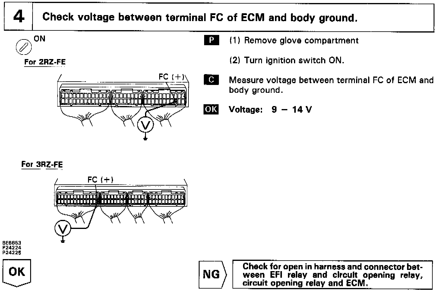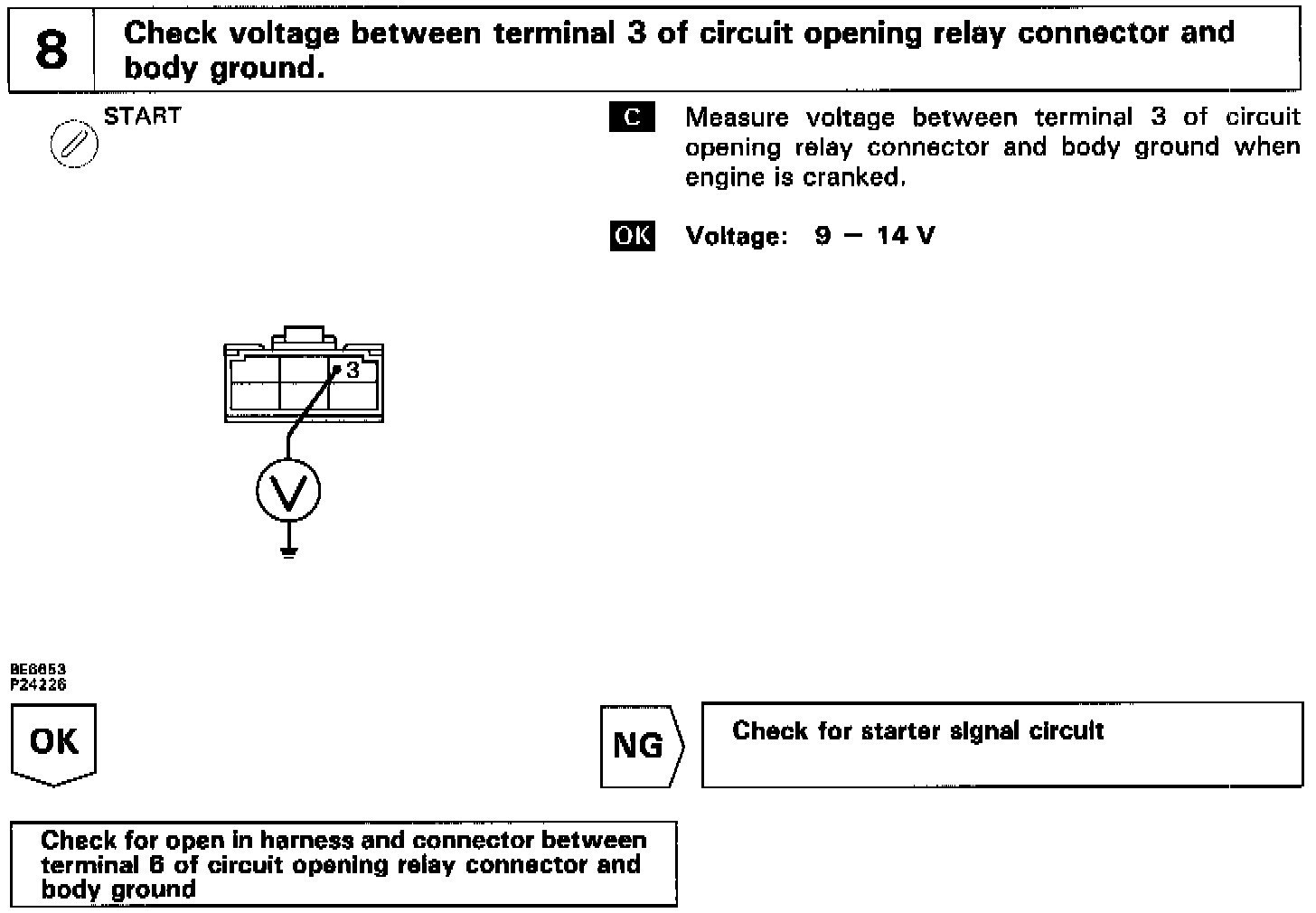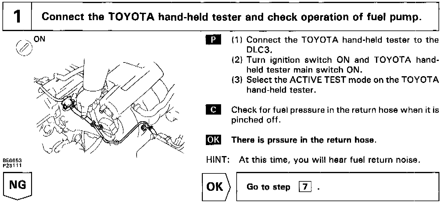 In the diagram below, when the engine is cranked, current flows from terminal ST of the ignition switch to the starter relay coil, the starter relay switches on and current flows to coil L1 of the circuit opening relay. Thus the circuit opening relay switches on, power is supplied to the fuel pump and the fuel pump operates.