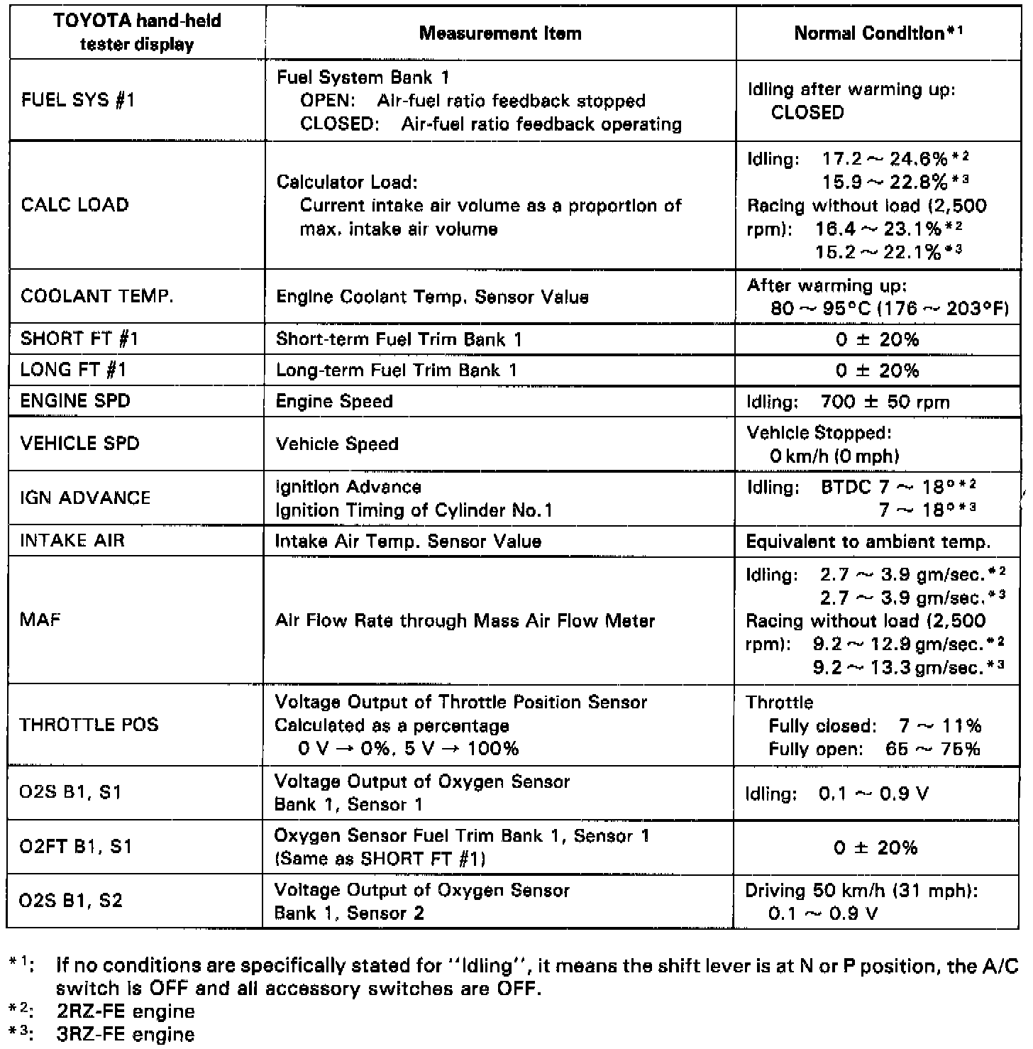 NOTICE: The values given below for "Normal Condition" are representative values, so a vehicle may still be normal even if its value varies from those listed here. So do not decide whether a part is faulty or not solely according to the "Normal Condition" here.