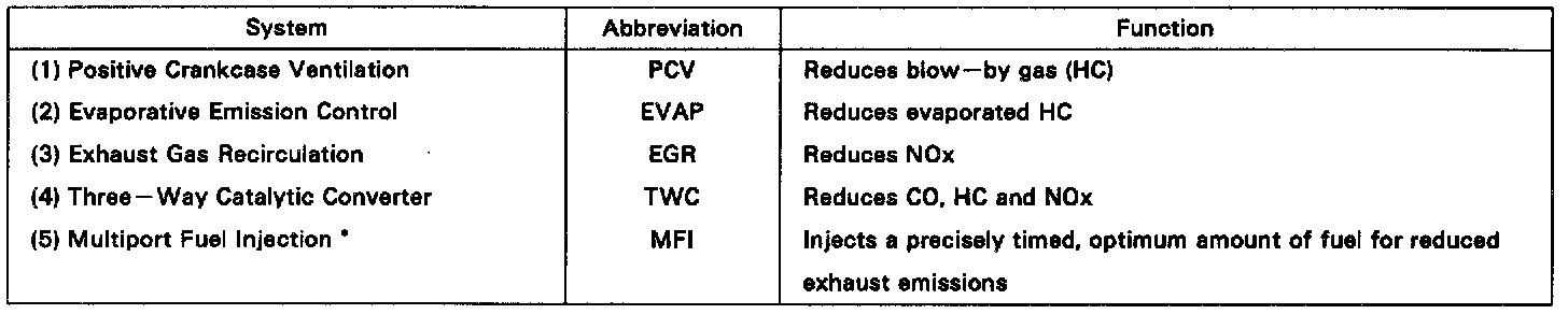 The emission control systems are installed to reduce the amount of CO, HC and NOx exhausted from the engine ((3), (4) and (5)), to prevent the atmospheric release of blow-by gas-containing HC(1) and evaporated fuel containing HC being released from the fuel tank (2).