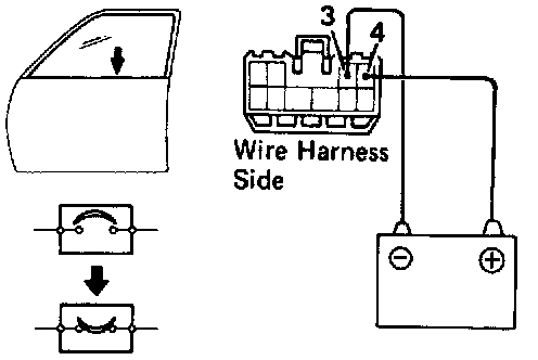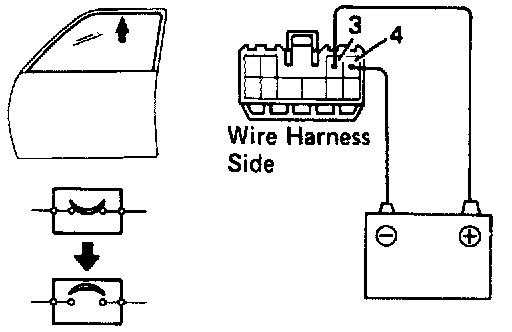 2. Connect the positive (+) lead from the battery to terminal 3 and the negative (-) lead to terminal 4 on the wire harness side connector, and raise the window to full closed position.