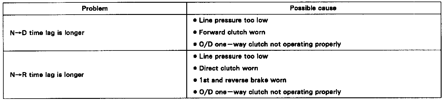 When the shift lever is shifted while the engine is idling. there will be a certain time lapse or lag before the shock can be felt. This is used for checking the condition of the O/D direct clutch. forward clutch. direct clutch. and 1st and reverse brake.