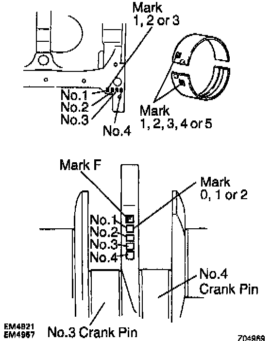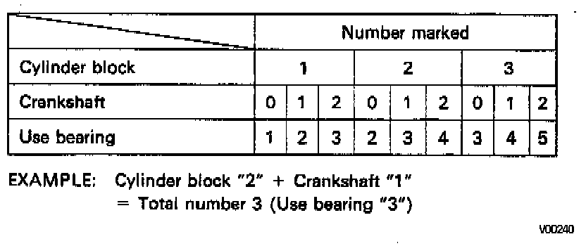 NOTE: If using a standard bearing, replace with one having the same number. If the number of the bearing cannot be determined, select the correct bearing by adding together the numbers imprinted on the cylinder block and crankshaft, then selecting the bearing with the same number as the total. There are 5 sizes of standard bearings, marked "1", "2", "3", "4", and "5" accordingly.