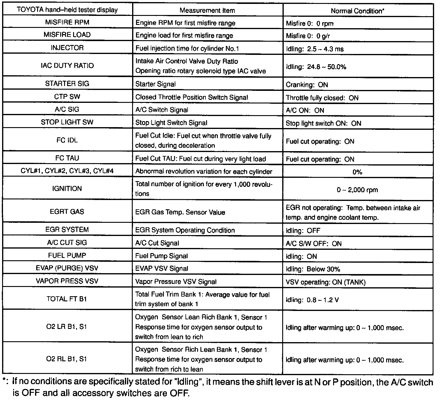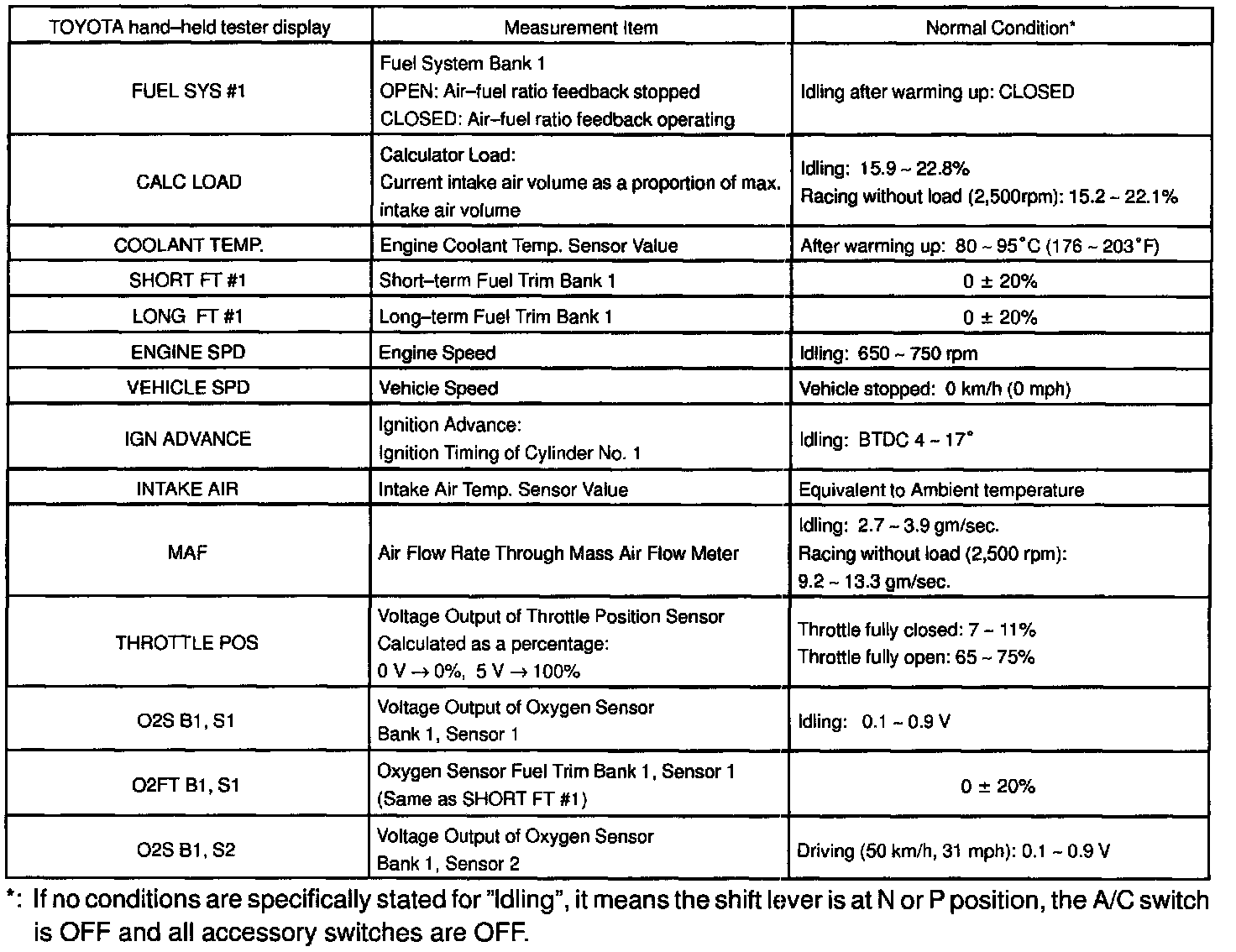 NOTICE: The values given below for "Normal Condition" are representative values, so a vehicle may still be normal even if its value varies from those listed here. So do not decide whether a part is faulty or not solely according to the "Normal Condition" here.