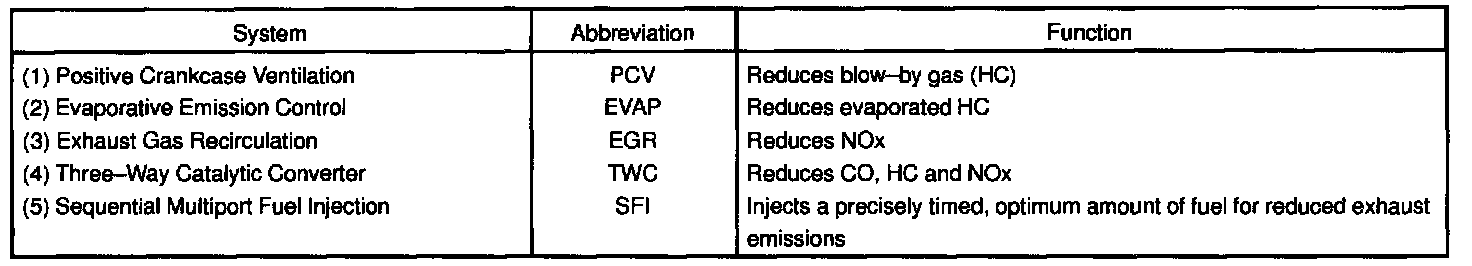 The emission control systems are installed to reduce the amount of CO, HC and NOx exhausted from the engine ((3), (4) and (5)), to prevent the atmospheric release of blow-by gas-containing HC (1) and evaporated fuel containing HC being released from the fuel tank (2).