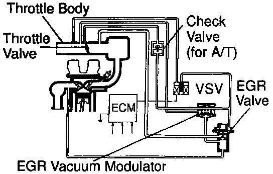 The EGR system recirculates exhaust gas, which is controlled to the proper quantity to suit the driving conditions, into the intake air mixture to slow down combustion, reduce the combustion temperature and reduce NOx emissions. The amount of EGR is regulated by the EGR vacuum modulator according to the engine load.