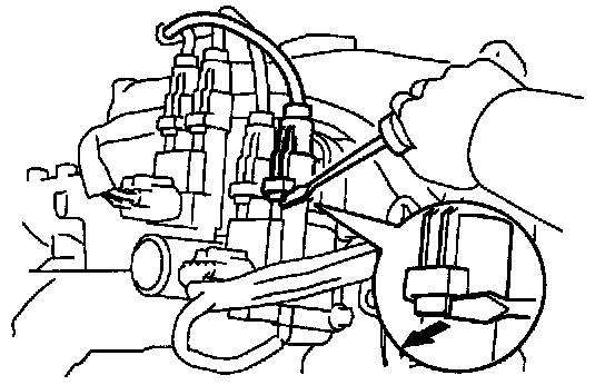 (1) Using a screwdriver, lift up the lock claw and disconnect the holder from the ignition coils.