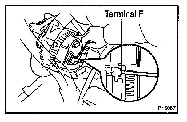 ^ With terminal F grounded, start the engine and check the voltmeter reading of terminal B.