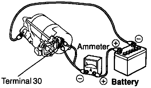 b. Check that the starter rotates smoothly and steadily with the pinion gear moving out. Check that the ammeter reads the specified current.