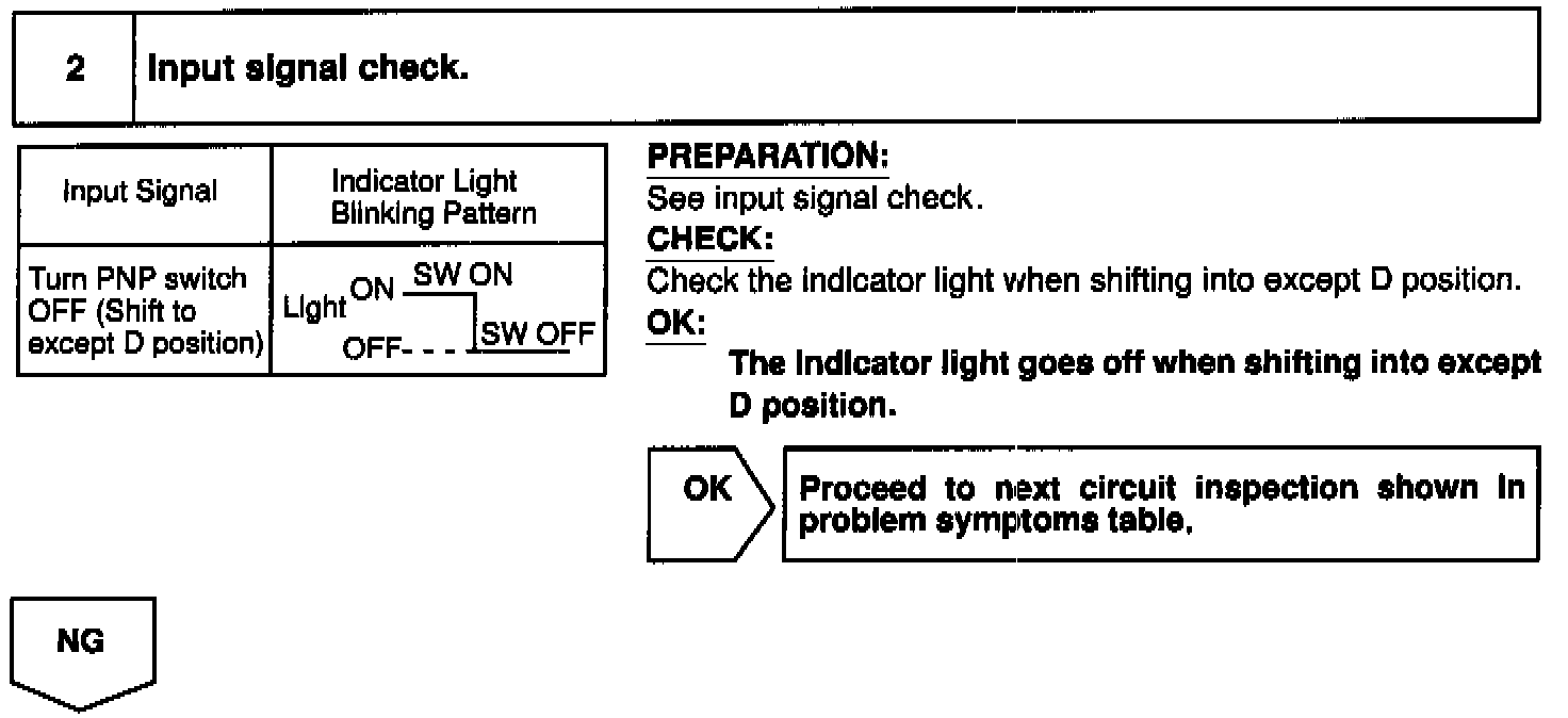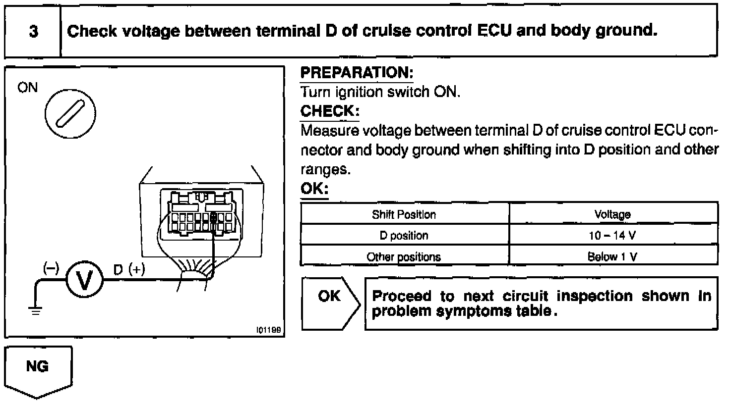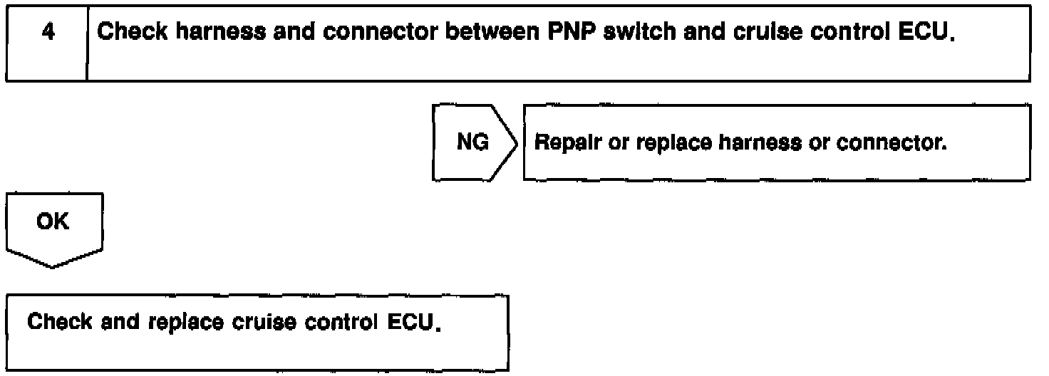 When the shift position is put in except D position, a signal is sent from the park/neutral position switch to the ECU. When this signal is input during cruise control driving, the ECU cancels the cruise control