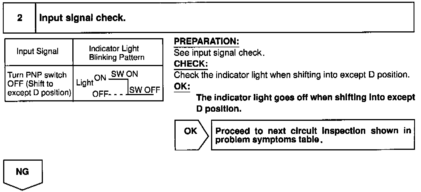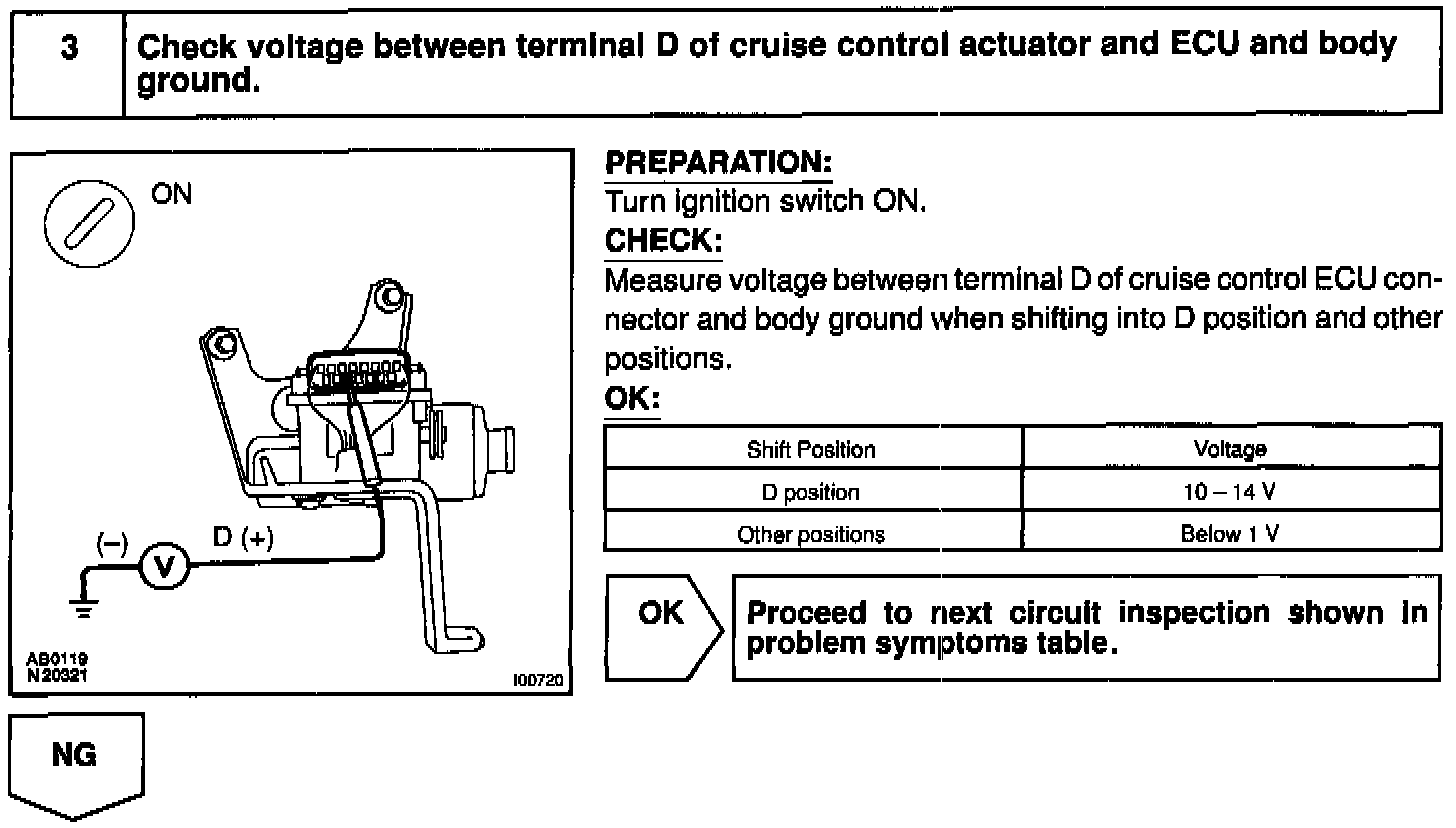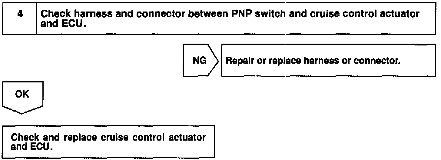 When the shift position is put in except D position, a signal is sent from the park/neutral position switch to the ECU. When this signal is input during cruise control driving, the ECU cancels the cruise control.