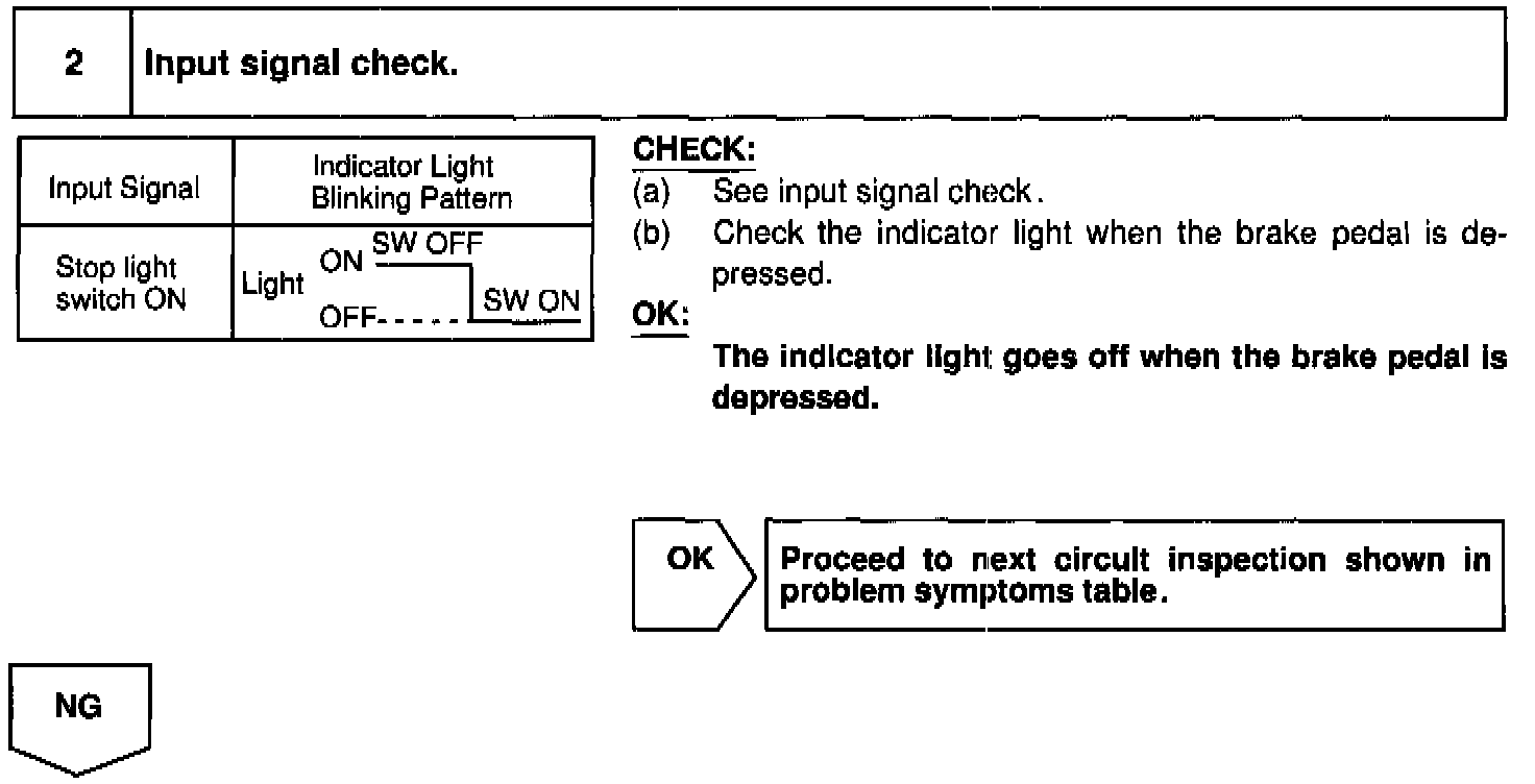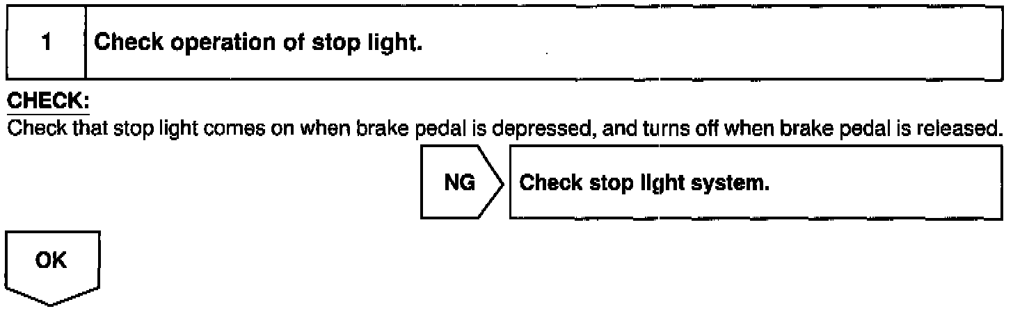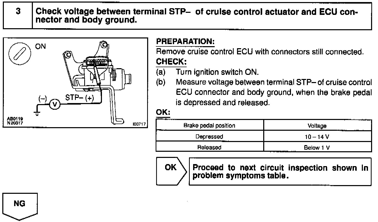 When the brake is ON, battery positive voltage normally is applied through the STOP fuse and stop light switch to terminal STP- of the ECU, and the ECU turns the cruise control OFF.
