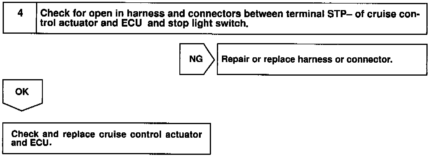 If the harness connected to terminal STP- has an open circuit, terminal STP- will have battery positive voltage and the cruise control will be turned OFF