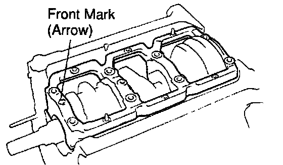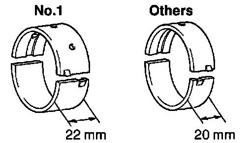 ^ Main bearings come in widths of 20 mm (0.79 inch) and 22 mm (0.87 inch). Install the 22 mm (0.87 inch) bearings in the No. 1 cylinder block journal position with the main bearing caps. Install the 20 mm (0.79 inch) bearings in the other positions.