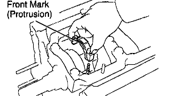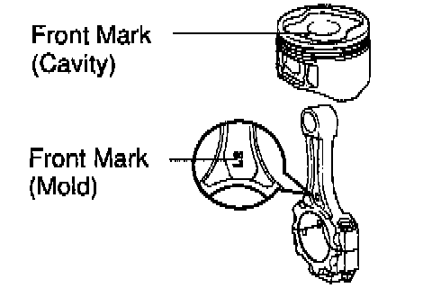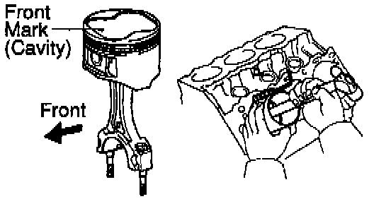 b. Using a piston ring compressor, push the correctly numbered piston and connecting rod assemblies into each cylinder with the front mark of the piston facing forward.