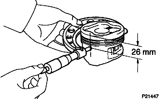 a. Using a micrometer, measure the piston diameter at right angles to the piston pin center line, 26 mm (1.02 inch) from the piston head.