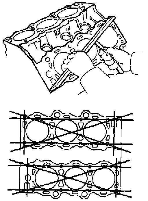Using a precision straight edge and feeler gauge, measure the surfaces contacting the cylinder head gasket for warpage.