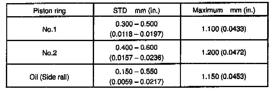If the end gap is greater than the maximum, replace the piston ring. If the end gap is greater than the maximum, even with a new piston ring, rebore all the 6 cylinders or replace the cylinder block.