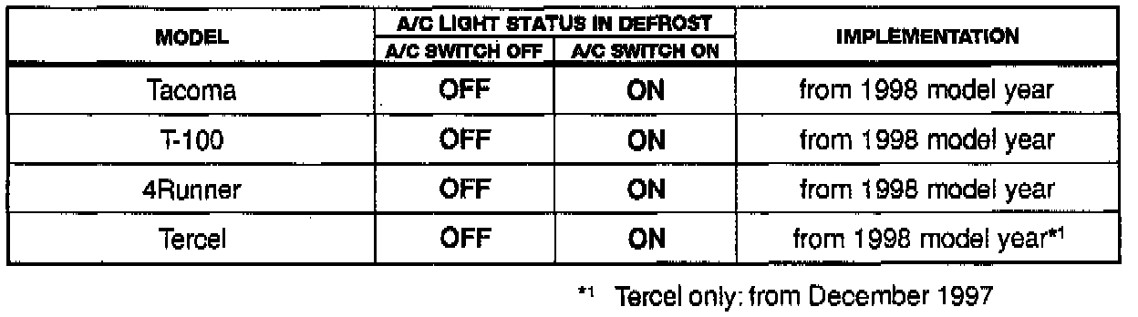 Introduction For the 1998 model year the operation of the A/C indicator light has been changed. With the A/C switch OFF, when the defroster mode is selected, the A/C indicator light does NOT turn ON even though the A/C compressor is in operation.