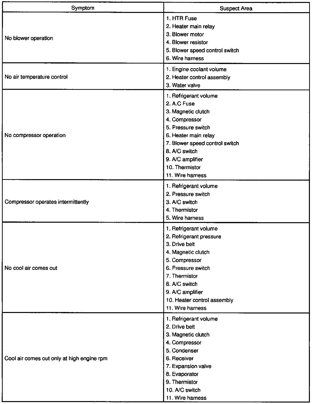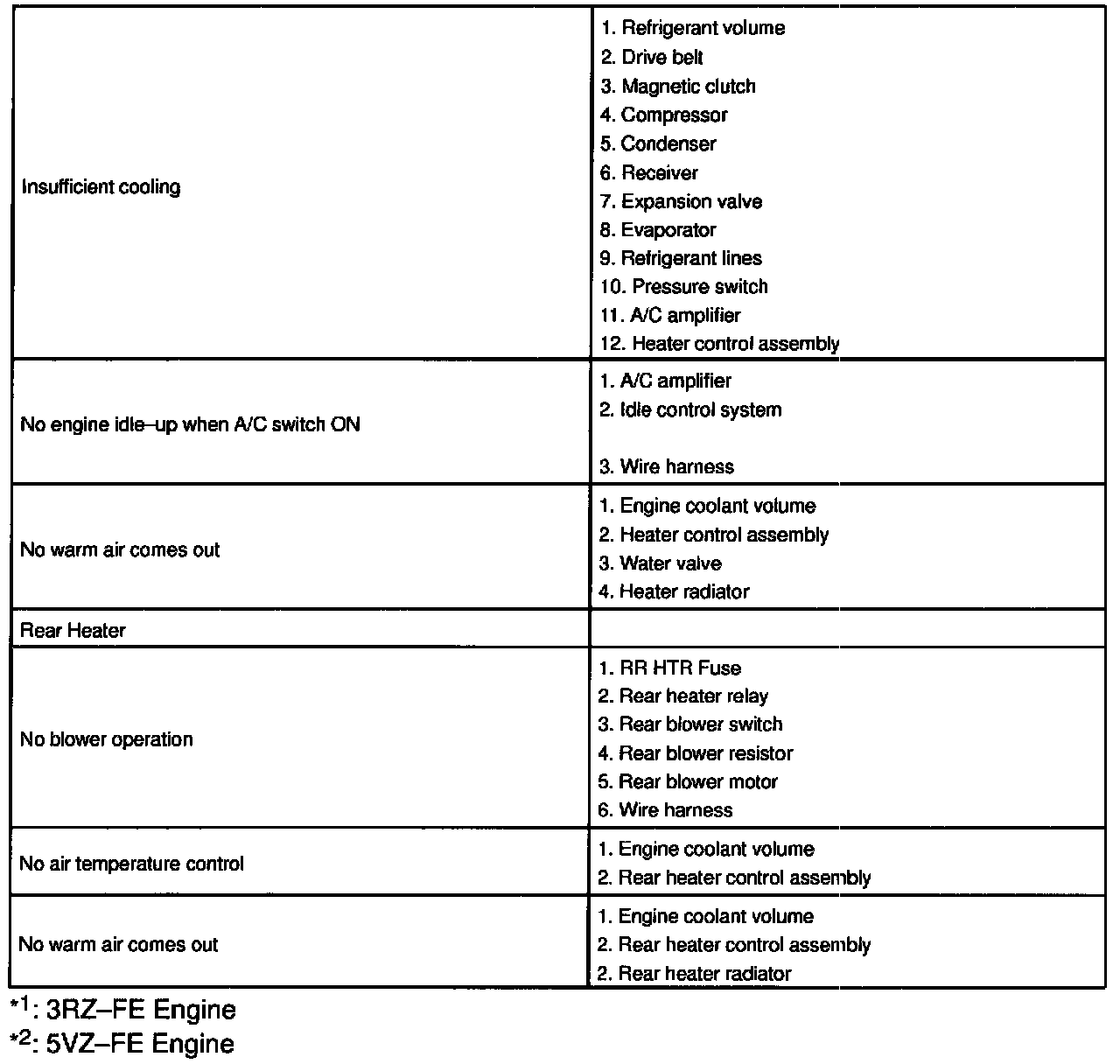 Use the table to help you find the cause of the problem. The numbers indicate the priority of the likely cause of the problem. Check each part in order. If necessary, replace these parts.