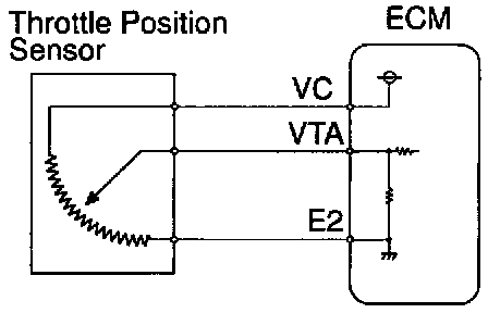 The throttle position sensor is mounted in the throttle body and detects the throttle valve opening angle. When the throttle valve is fully closed, a voltage of approximately 0.3 ~ 1.0 V is applied to terminal VTA of the ECM. The voltage applied to terminals VTA of the ECM increases in proportion to opening angle of the throttle valve and becomes approximately 2.7 ~ 5.2 V when the throttle valve is fully opened. The ECM judges the vehicle driving conditions from these signals input from terminals VTA and uses them as one of the conditions for deciding the air-fuel ratio correction, power increase correction and fuel-cut control etc.