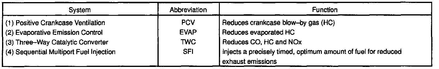 The emission control systems are installed to reduce the amount of CO, HC and NOx exhausted from the engine ((3), (4) and (5)), to prevent the atmospheric release of blow-by gas-containing HC (1) and evaporated fuel containing HC being released from the fuel tank (2).