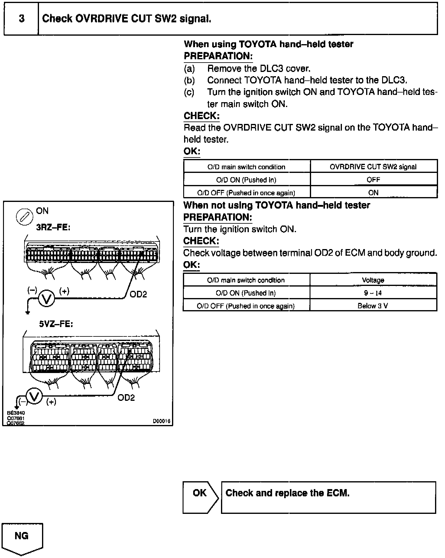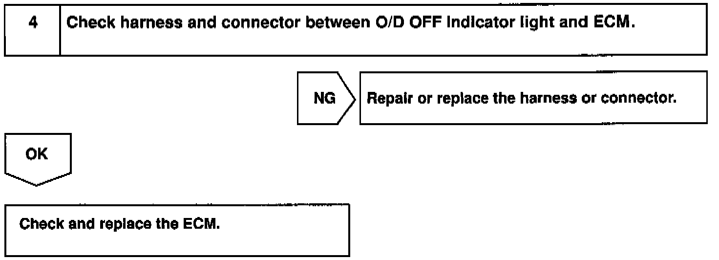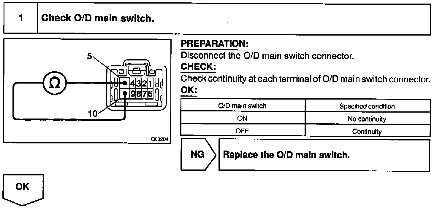 The O/D main switch contacts go open when the switch is pushed in and go closed when it is pushed out. When O/D main switch is OFF the O/D OFF indicator light lights up and the ECM prohibits shifting O/D.