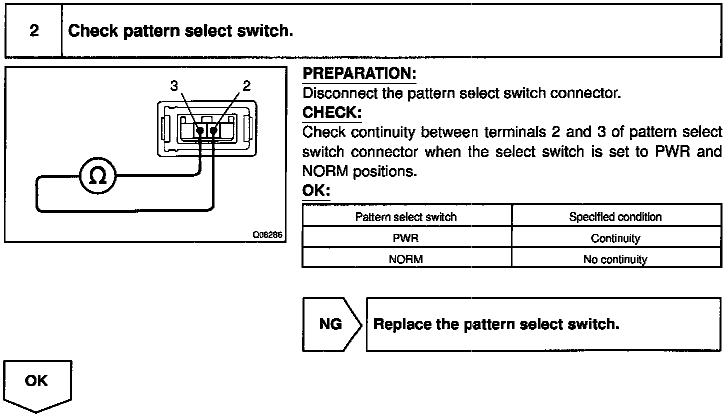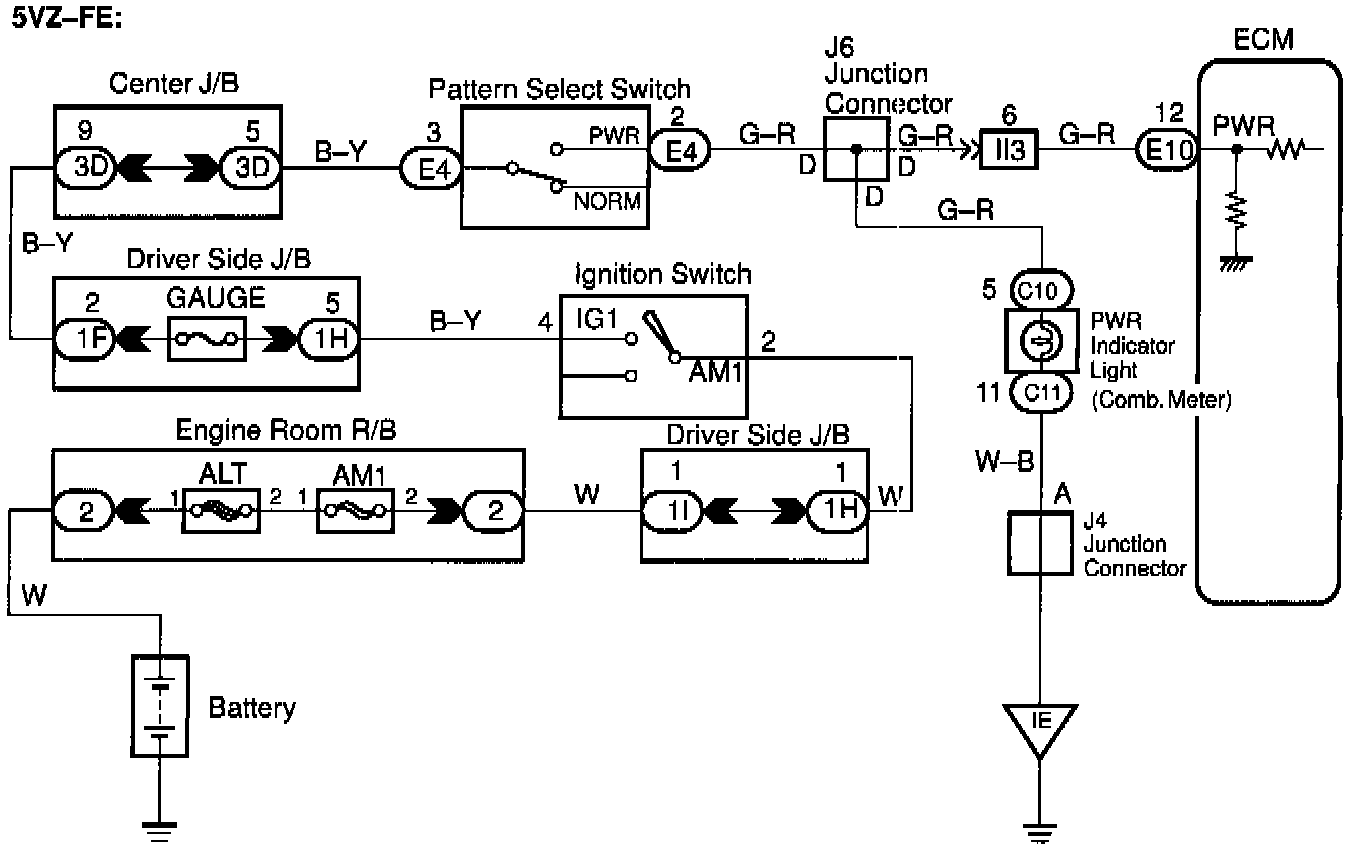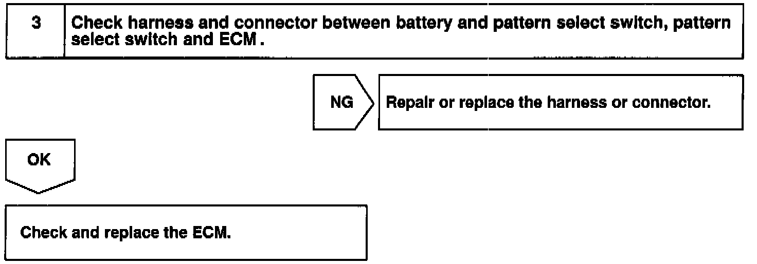 The ECM memory contains the shift programs for the NORMAL and POWER patterns, 2 position, L position and the lock-up patterns. Following the programs corresponding to the signals from the pattern select switch, the park/neutral position and other various sensors, the ECM switches the solenoid valves ON and OFF, and controls the transmission gear change and the lock-up clutch operation.