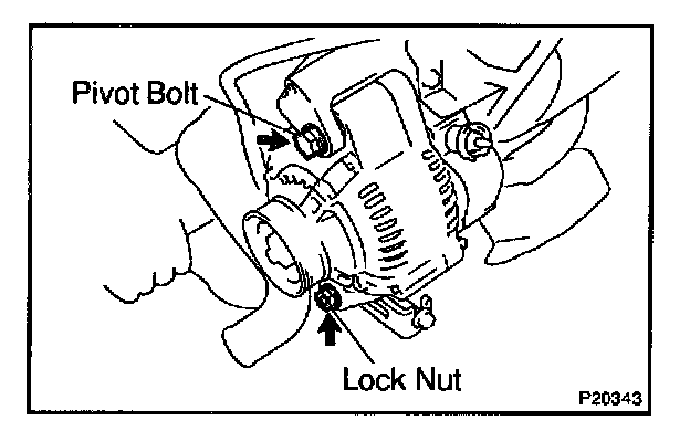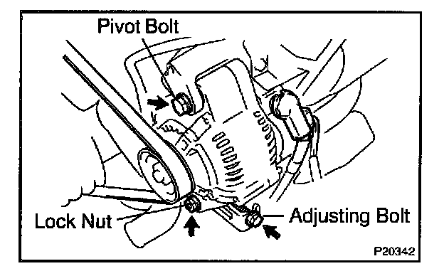 Loosen the adjust lock nut, adjusting bolt and pivot bolt, and remove the drive belt.