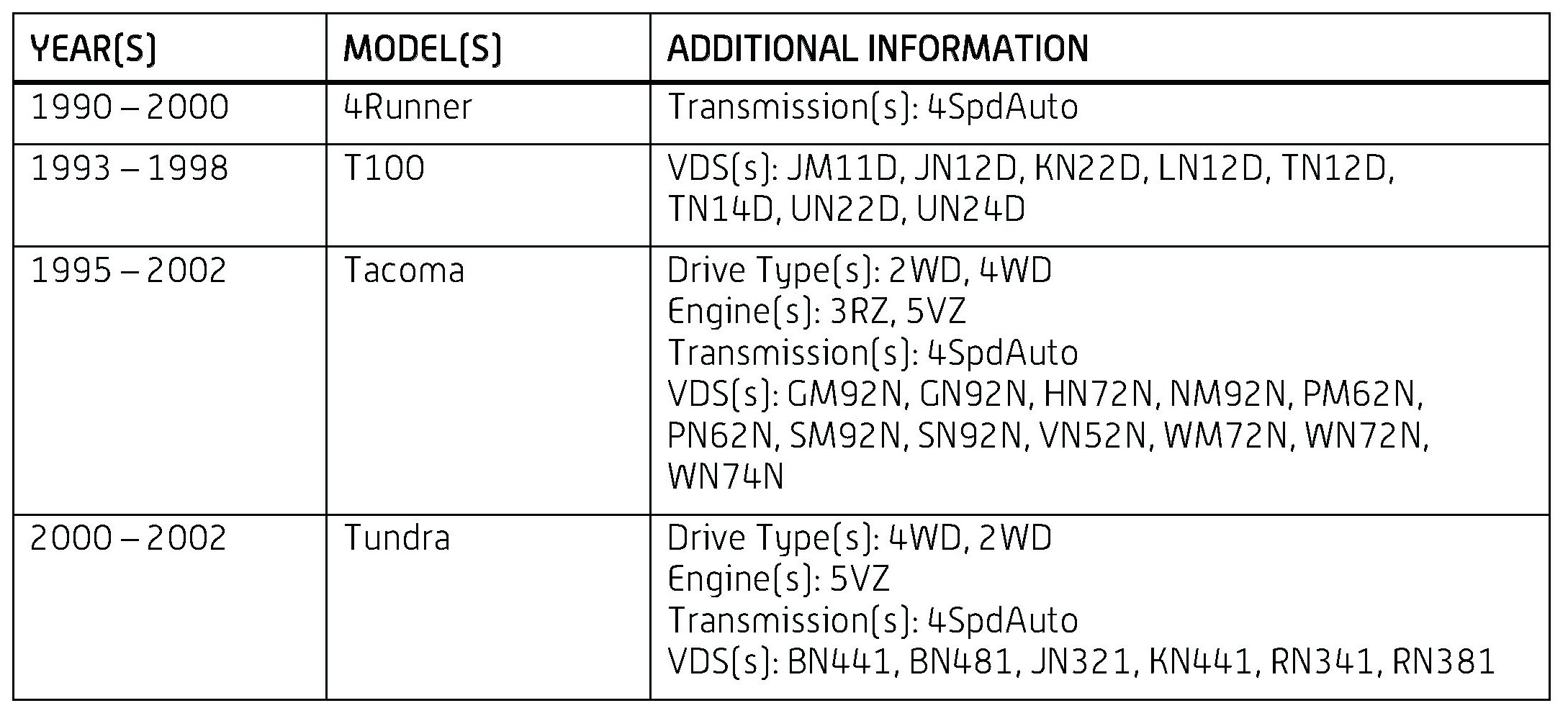 '90-'02 Applicable Toyota Models equipped with A340 Transmission