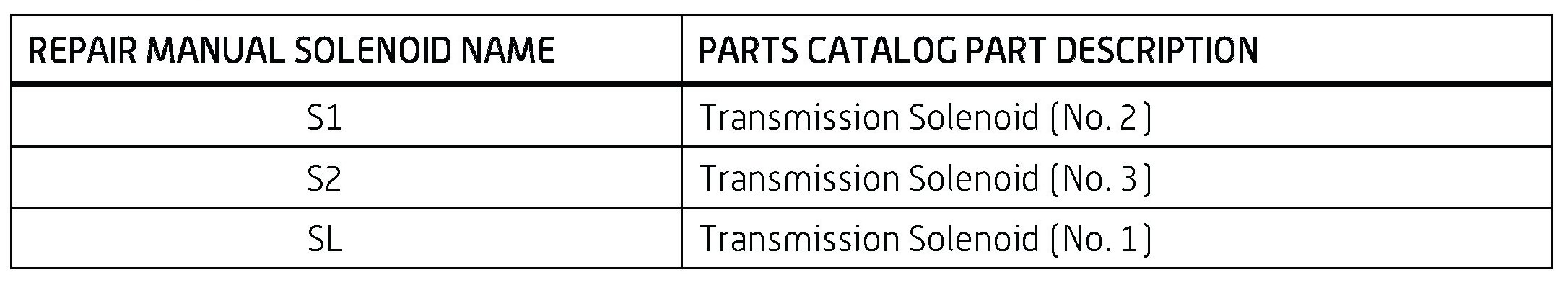 Provided is a chart listing the Repair Manual name of each solenoid used in the 3-solenoid version of the A340 transmission, as well as the part name description provided in the Electronic Parts Catalog.