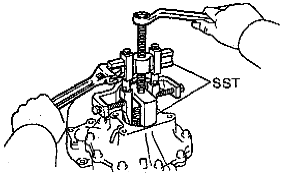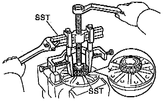 Using the SST 0995-40010 (09951-4010, 09952-04010, 09953-04020, 09954-04010, 09954-04010, 09955-04060, 09957-4010, 09958-04010), 09950-60010 (09951-00480), remove the two side bearings from the differential case.