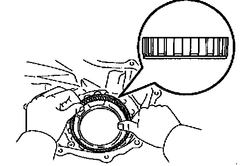 ^ Align the synchronizer ring slots with the shifting keys, and install it on the high and low clutch hub.