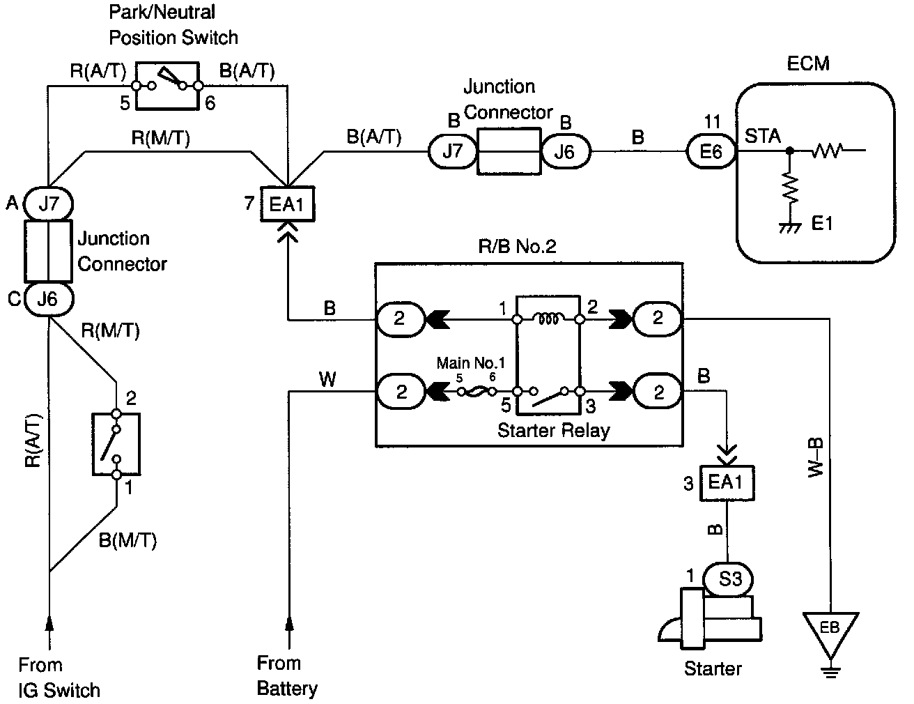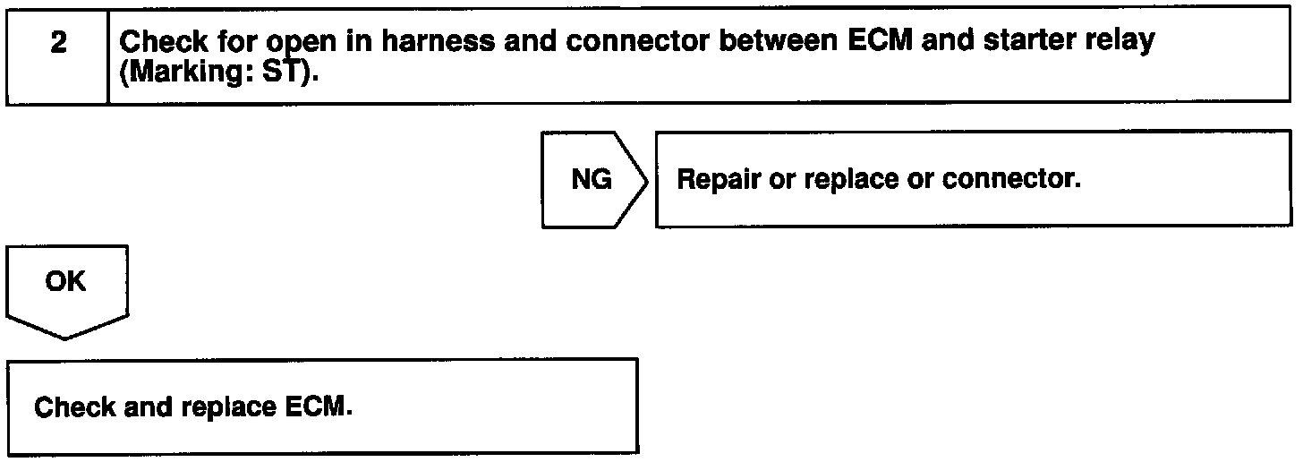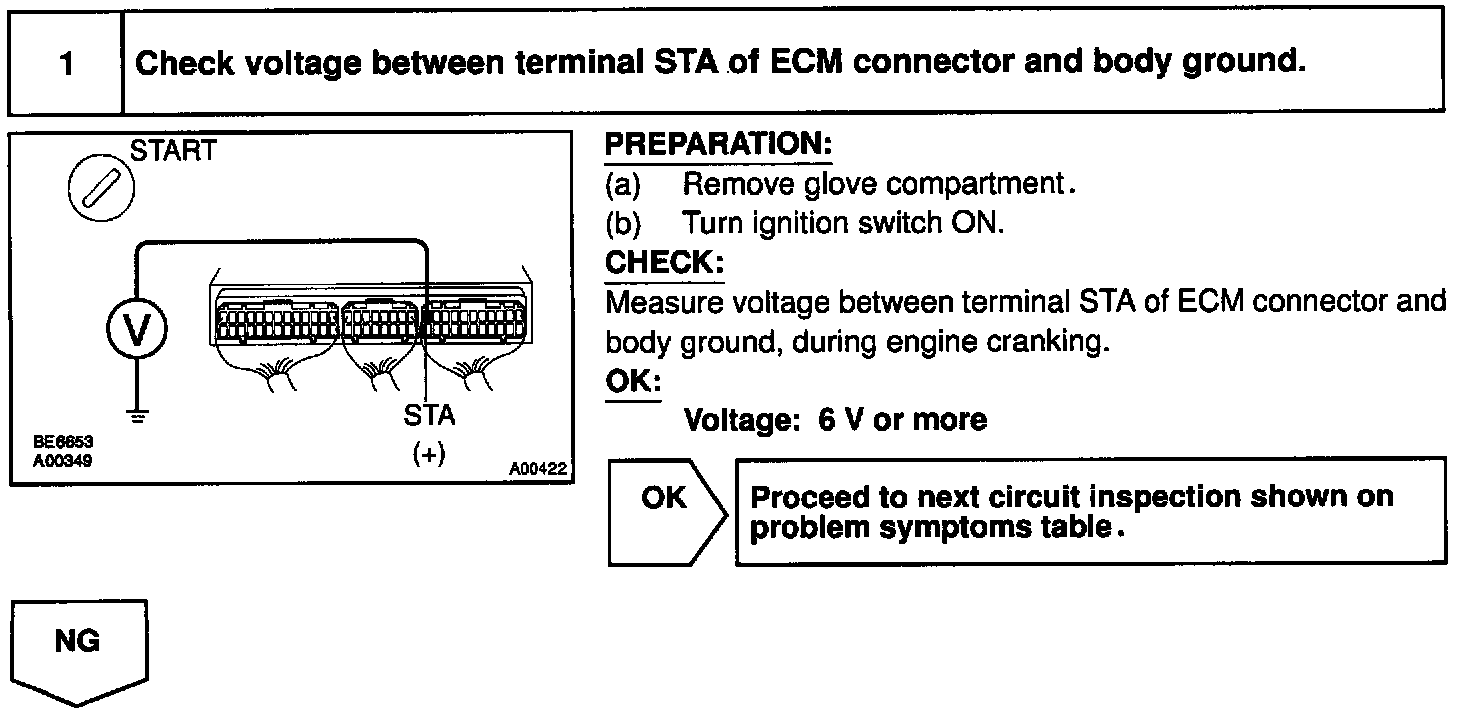 When the engine is cranked, the intake air flow is slow, so fuel vaporization is poor. A rich mixture is therefore necessary in order to achieve good startability. While the engine is being cranked, the battery positive voltage is applied to terminal STA of the ECM. The starter signal id mainly used to increase the fuel injection volume for the starting injection control and after-start injection control.