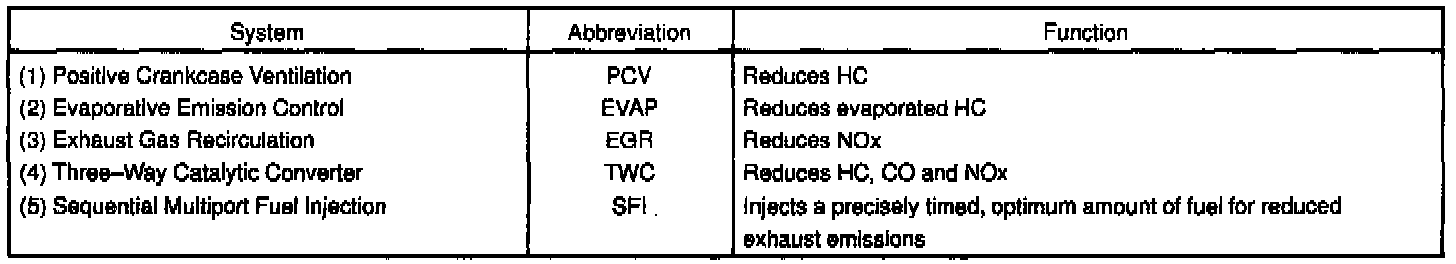 The emission control systems are installed to reduce the amount of HC, CO and NOx exhausted from the engine ((3), (4) and (5)), to prevent the atmospheric release of blow-by gas-containing HC (1) and evaporated fuel containing HC being released from the fuel tank (2).