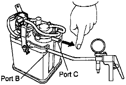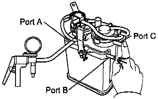 (e) While holding port C closed, apply vacuum (1.23 kPa, 9.2 mm Hg, 0.36 in.Hg) to port A and check that air flows into port B.