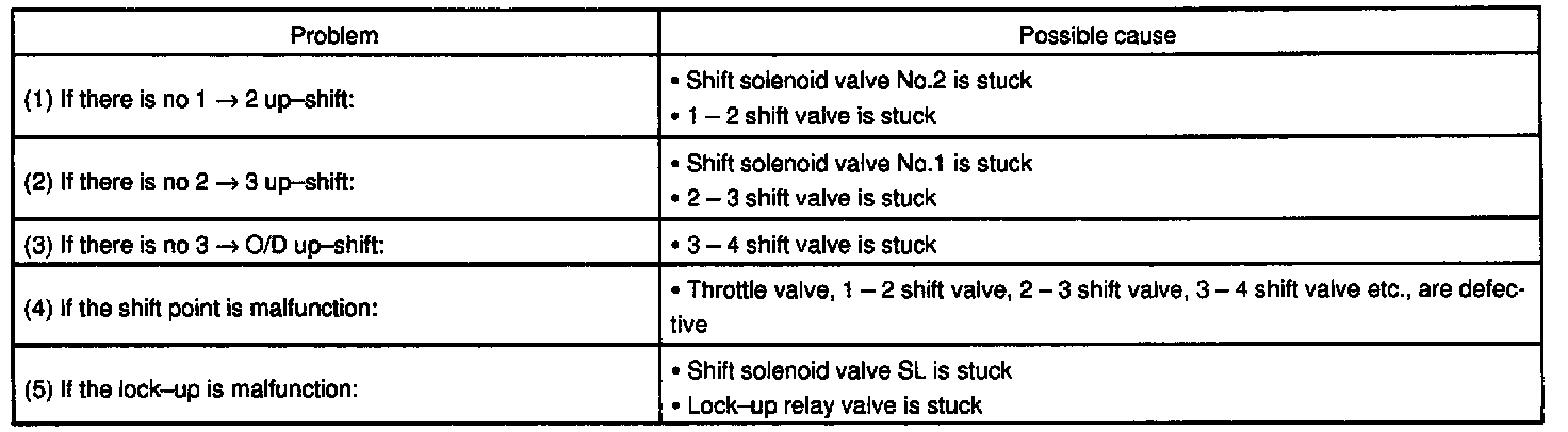 (1) Check to see that 1 -> 2, 2 -> 3 and 3 -> O/D up-shifts should take place, and that the shift positions conform to the automatic shift schedule.