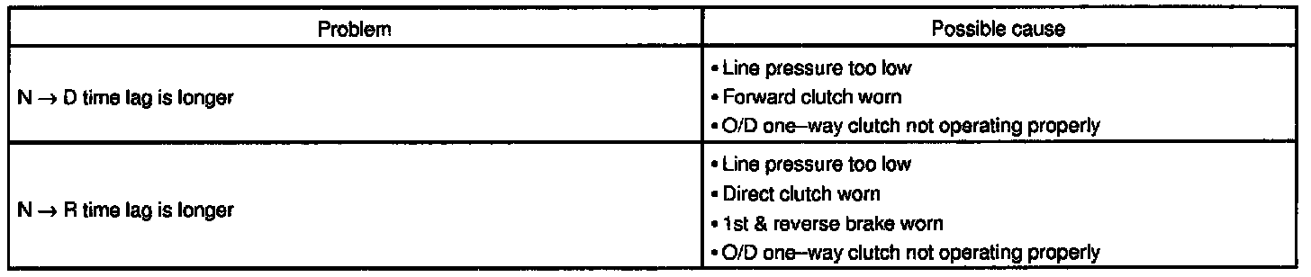 When the shift lever is shifted while the engine is idling, there will be a certain time lapse or lag before the shock can be felt. This is used for checking the condition of the O/D direct clutch, forward clutch., and 1st & reverse brake.
