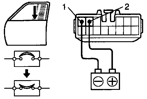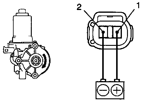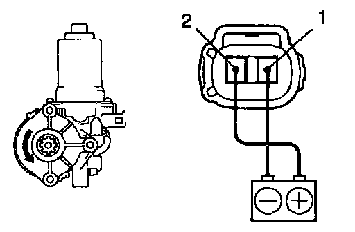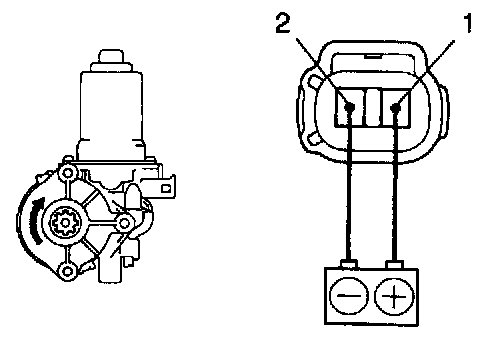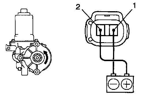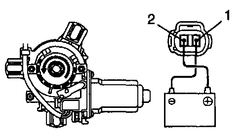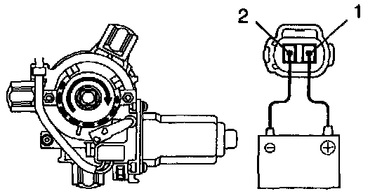 b. Connect the positive (+) lead from the battery to terminal 1 and the negative (-) lead to terminal 2 on the wire harness side connector and raise the window to full closed position.