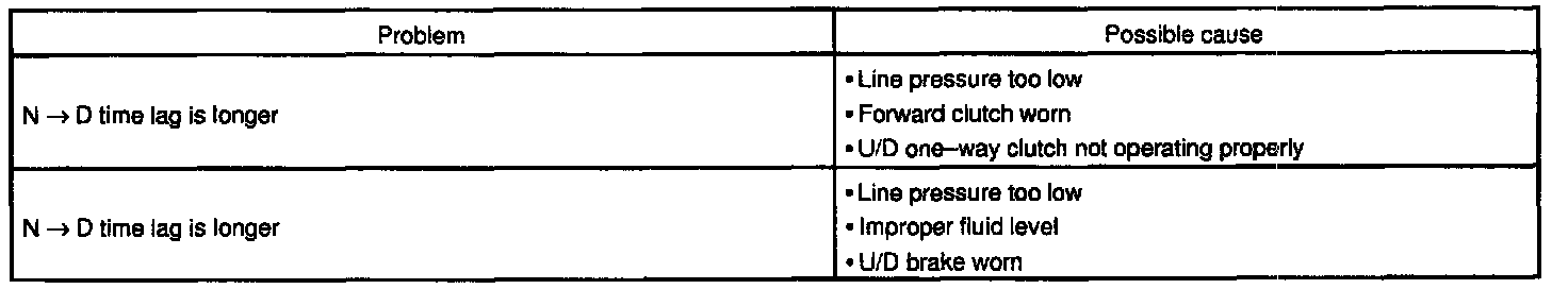 When the shift lever is shifted while the engine is idling, there will be a certain time of lapse or lag before the shock can be felt. This is used for checking the conditions of the U/D direct clutch, forward clutch, direct clutch, and 1st & reverse brake.