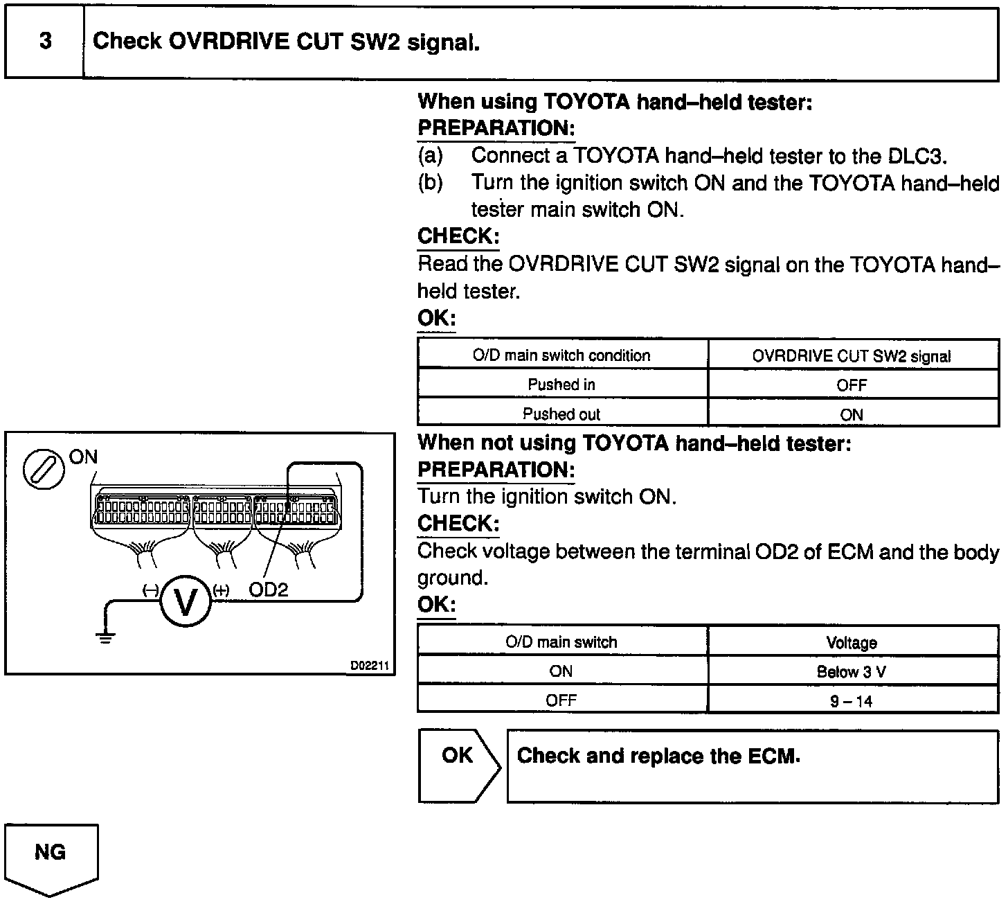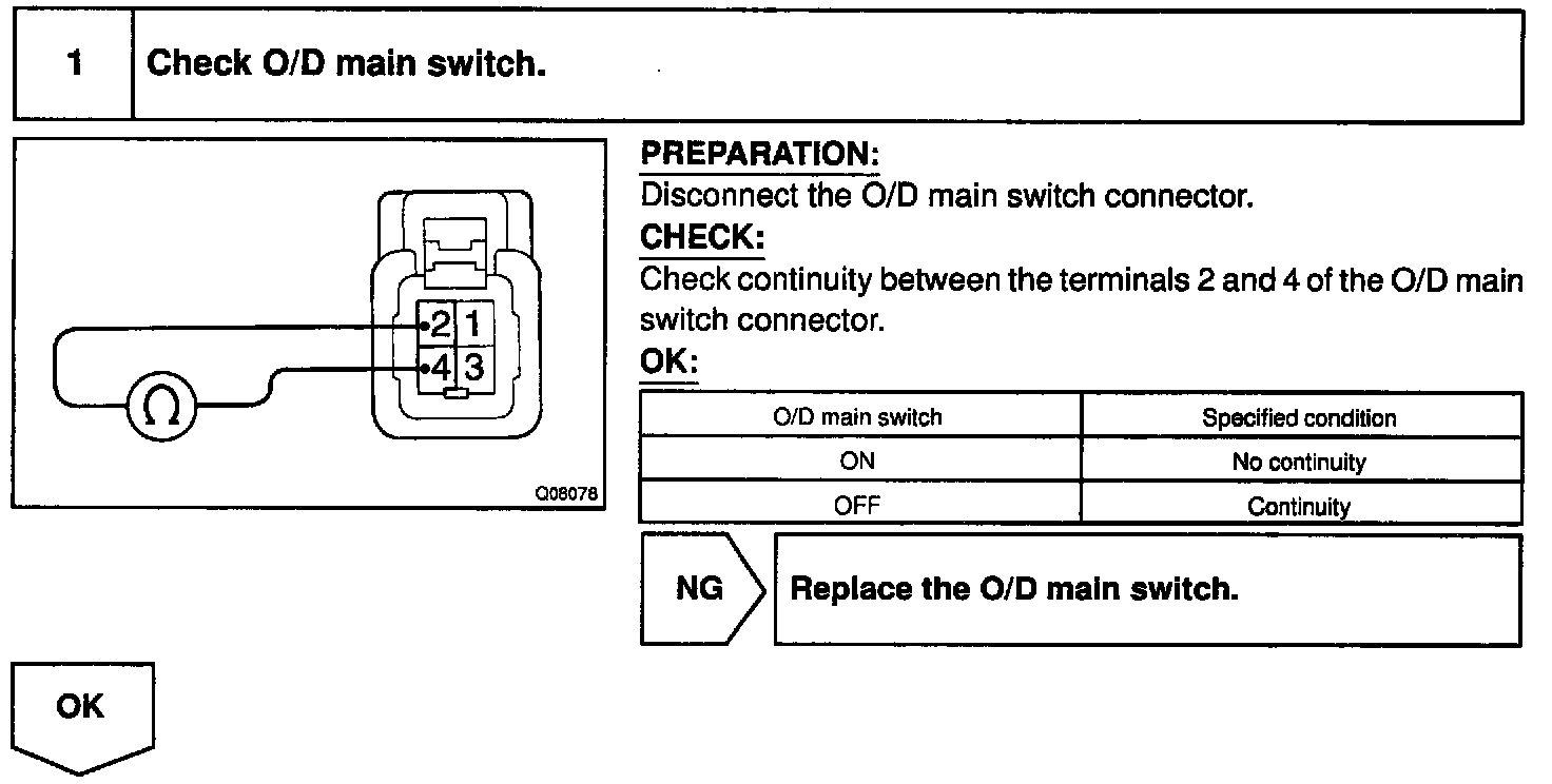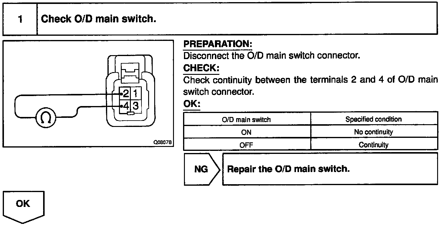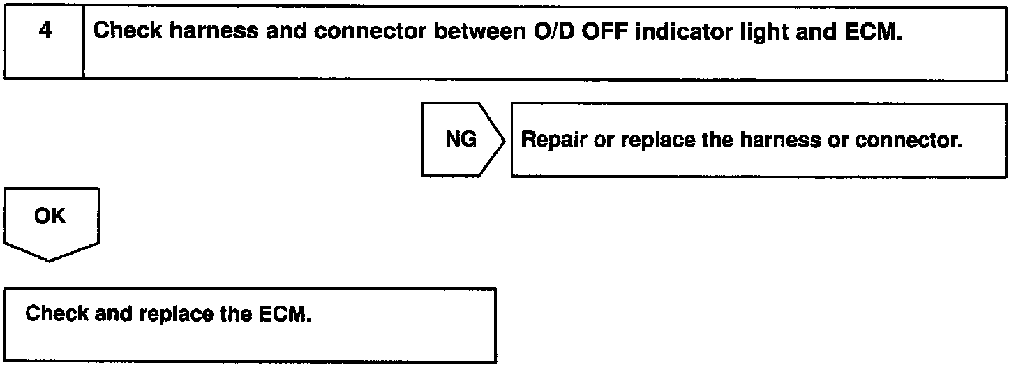 The O/D main switch contacts go open when the switch is pushed in and go closed when it is pushed once again. When O/D main switch is in OFF position, the O/D OFF indicator light lights up, and the ECM prohibits shifting to O/D.